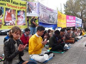 ![]() 法轮功学员在中联办门前,张起法办江、罗、刘、周等迫害元凶的幡旗,并宣读声明 |