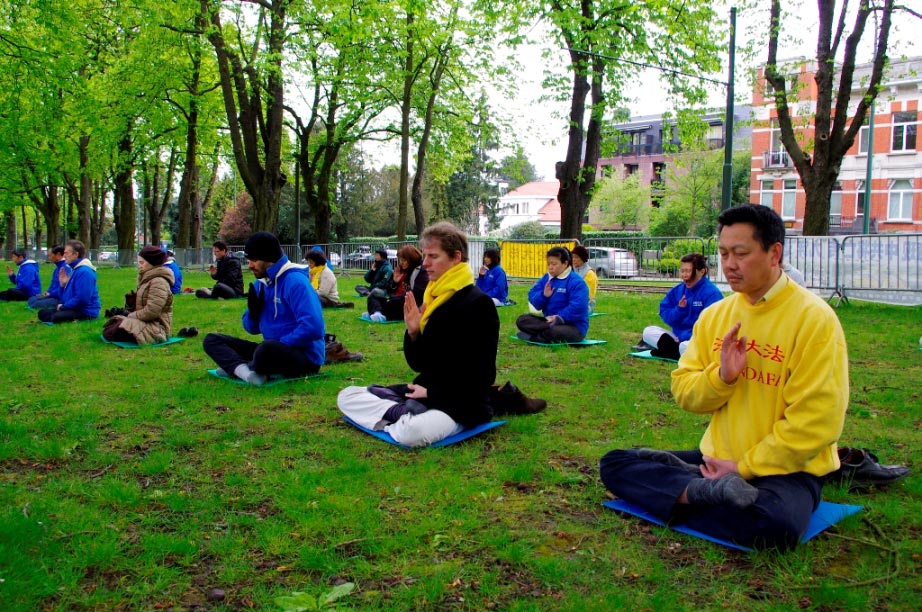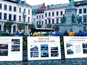 在当天一早,比利时学员来到中领馆前集体炼功,并打出:“法轮大法好”,“纪念法轮功四·二五和平上访十三年”,“中共必须停止迫害法轮功”,“法办江泽民、周永康、罗干、刘京”等大量的横幅。