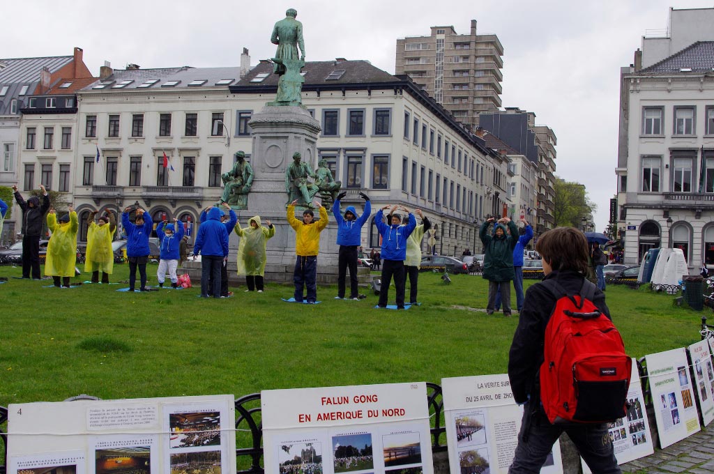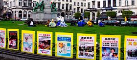 ![]() 纪念四·二五,比利时学员在欧洲议会前的卢森堡广场上摆放真相图片展,及展示法轮功的功法。 |
