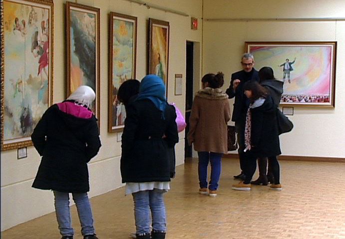 伴随着悠扬的音乐,整个展厅平和安详。早上,美展刚开始不久,卑诗省大学的一些教授和学生们就纷至沓来,有一位教师带领全班学生来参观美展,还有很多卑诗省大学艺术系和音乐系的学生慕名而来。很多华裔的留学生和大陆华人也前来观看真善忍美展,并且有大陆华人详细询问美术作品细节以及法轮大法真相。