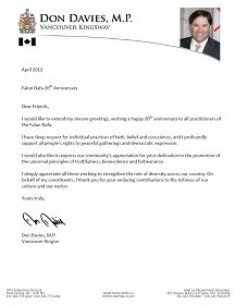 为庆祝即将到来的法轮大法洪传二十周年纪念,加拿大温哥华Kingsway选区的国会议员唐·戴维斯先生致信当地法轮功学员,表达美好的祝愿,并对法轮功学员坚守信仰和良知表示深深的敬意。