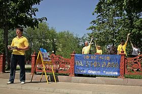 二零一二年四月二十九日,乌克兰法轮功学员在顿涅茨克市中心公园举行活动,向人们介绍以“真、善、忍”为修炼原则的法轮功,并揭露中共十三年来对法轮功学员的残酷迫害。