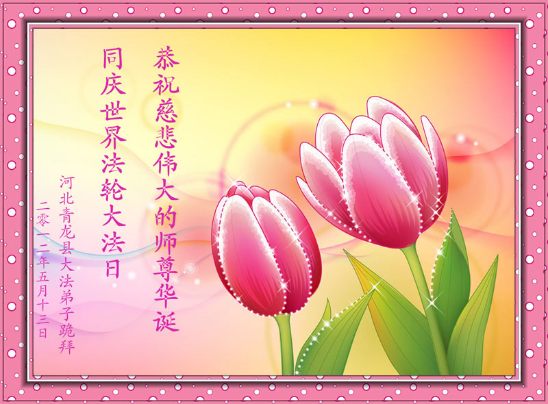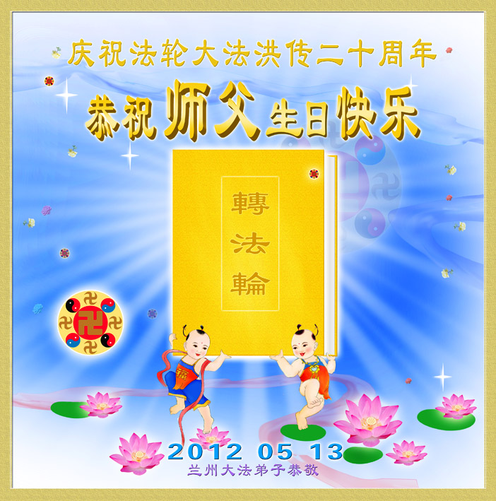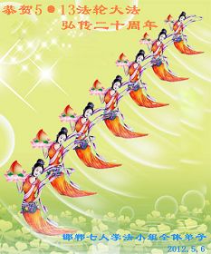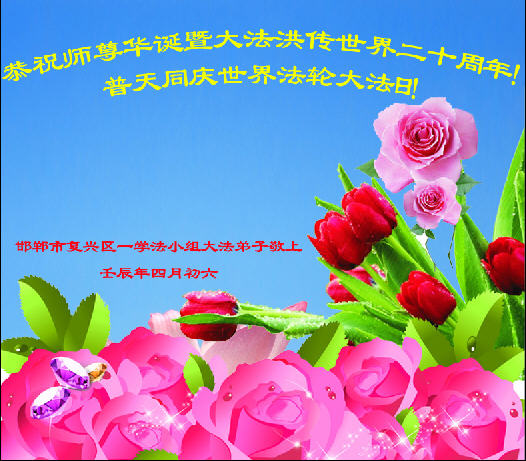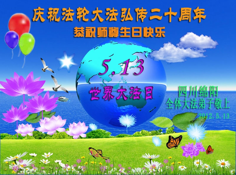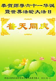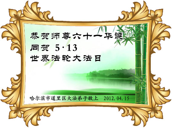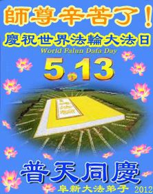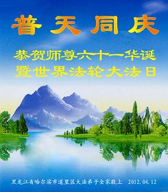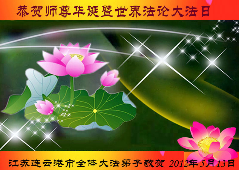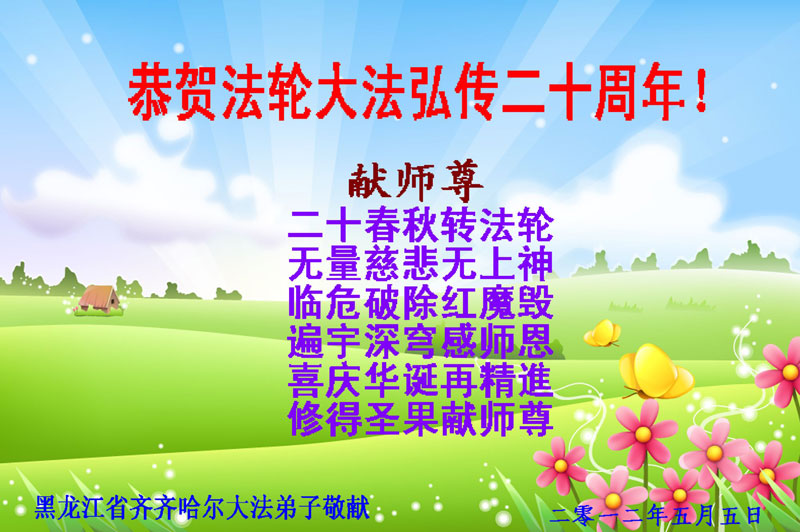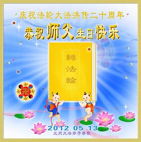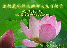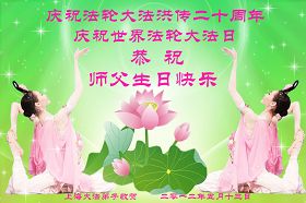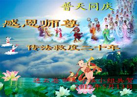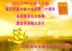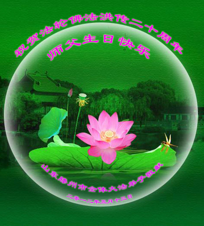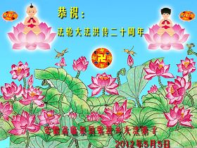 【明慧网二零一二年五月十日】二十年前的五月,李洪志师父在中国长春将法轮大法公开传出于世,二十年后的今天,法轮大法洪传全球,亿万修炼者在大法“真善忍”的指导下道德升华,获得身心健康。十三年来,每年的五月十三日,世界各地的法轮大法弟子,都向明慧网寄来贺卡贺词,庆祝“世界法轮大法日”,恭贺师尊华诞。这里是明慧编辑部已整理出来的部份来自中国大陆华东地区大法弟子的贺卡、贺信。