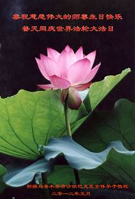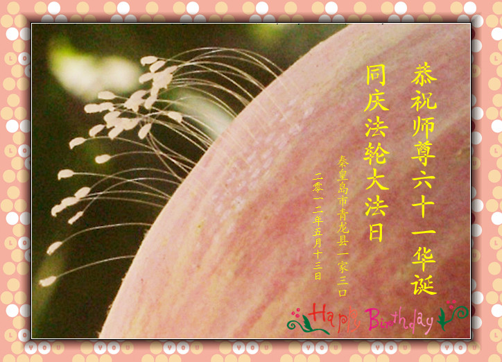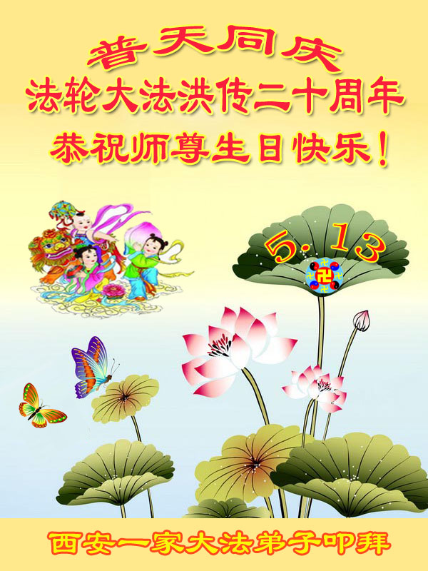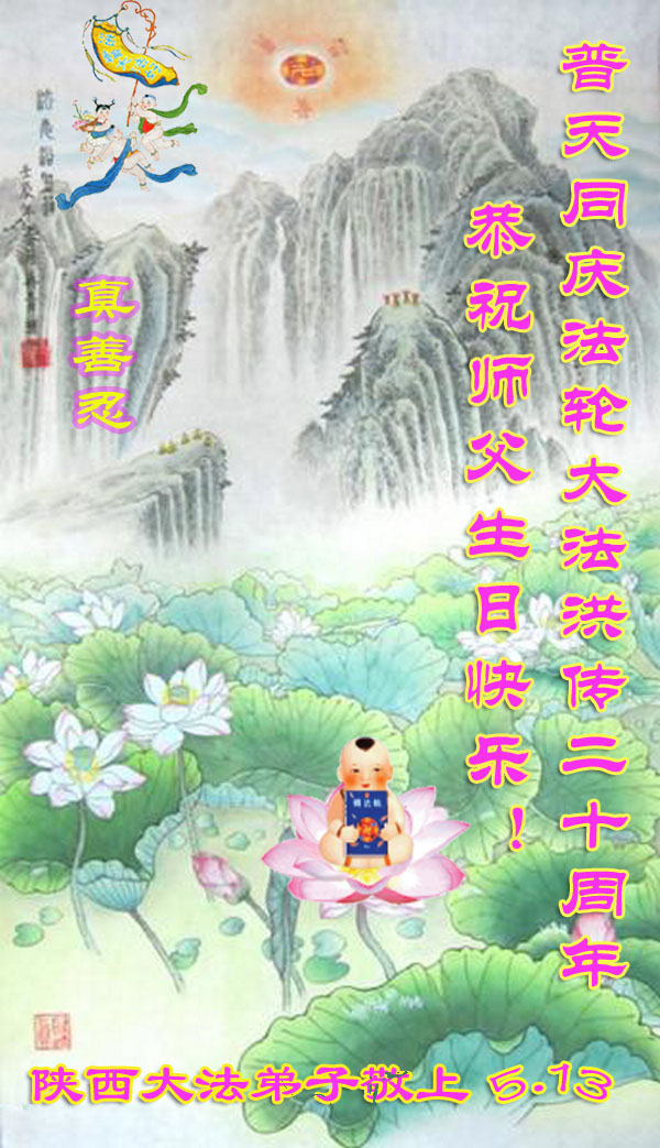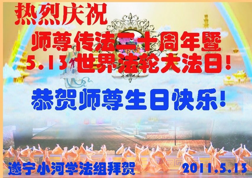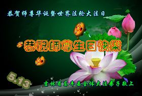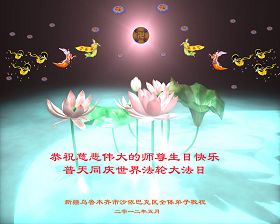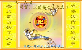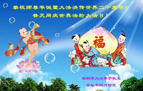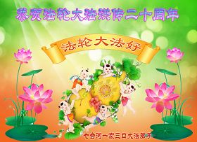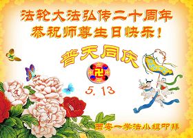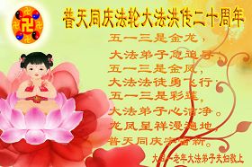 看到越来越多的世人觉醒,法轮功学员真正感受到法轮大法洪传世界的巨大变化。波兰大法弟子在全世界同庆大法弘传二十周年之日,合十感恩师父的慈悲救度,感恩“真、善、忍”为宇宙众生带来的希望,感恩法轮大法佛光普照,礼义圆明。贺卡集锦:同庆5.13 贺师尊华诞