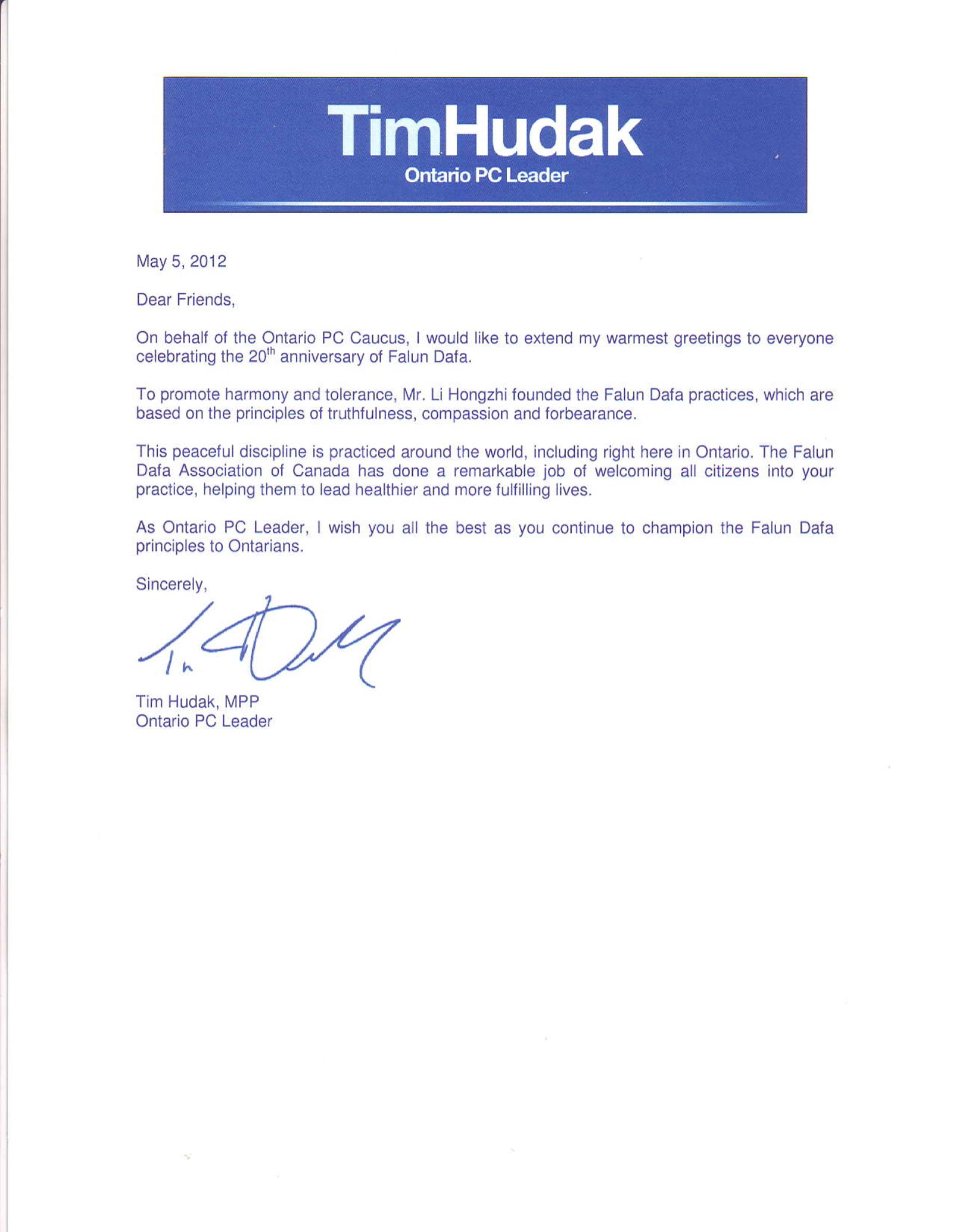 【明慧网二零一二年五月十日】在全球大法弟子庆祝第十三届“世界法轮大法日”,法轮功创始人李洪志师父的六十一华诞,以及法轮大法洪传二十周年庆典之际,加拿大安大略省多位省议员(MPP)发贺信,感谢法轮功修炼者帮助民众获得健康,并呼吁“希望不久的将来,法轮功能够获得应有的公正对待”。