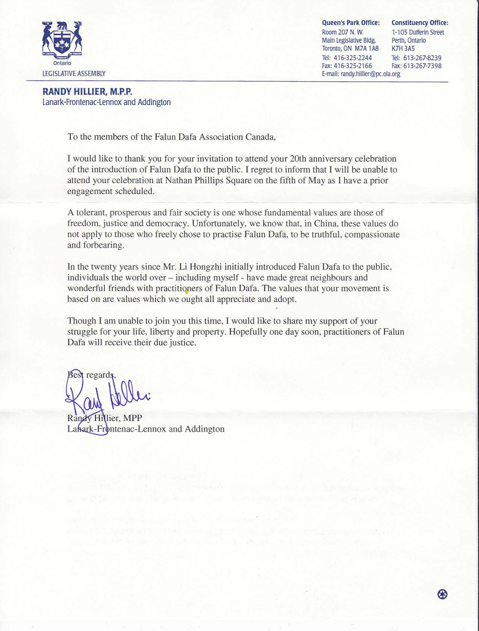 省议员Randy Hillier在信中表示:“致加拿大法轮大法协会:一个宽容,繁荣,公平的社会是建立在自由,正义和民主等价值观之上的。遗憾的是,在今日的中国,信仰真善忍的法轮功学员却没有自由修炼的环境。自二十年前李洪志先生传出法轮大法至今,全世界的许多民众--包括我自己--都和法轮功学员成为了好邻居,好朋友。你们所信奉的价值观是每个人都应该尊重和遵循的。尽管我此次不能亲临庆典现场,我要借此机会表达对你们争取自由和生存权的支持。希望不久的将来,法轮功能够获得应有的公正对待。”