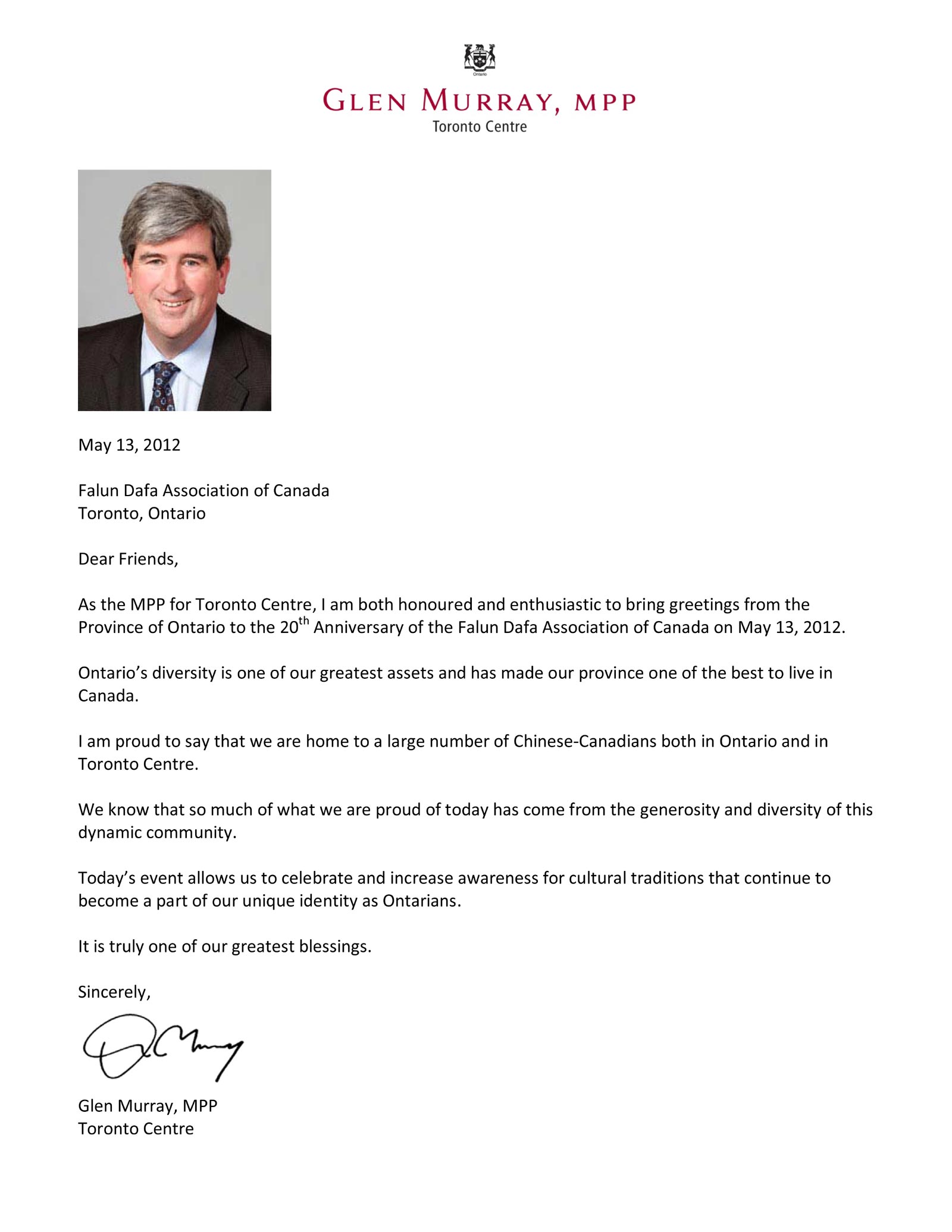 加安大略省议员Glen Murray在信中表示:“亲爱的朋友们,作为多伦多中心区省议员,我很荣幸的和满腔热忱的代表安大略省,向二零一二年五月十三日——法轮大法洪传二十周年纪念日致以最热烈的祝贺!一直以来种族及文化的多样性发展是安省最宝贵的一笔财富,也是我省成为加拿大最宜居省份的原因之一。我今天可以很骄傲的宣布,华裔加拿大人是安省和多伦多中心区这个大家庭的重要成员。我们的骄傲来自于这说明我们是一个如此宽容博大、兼收并蓄的充满开放精神的强大社区。今天的活动可以让我们了解更多文化传统的瑰宝,这无疑是最值得庆祝的事情,也是我们安省独特人文传统的一部份。再次致以我们最诚挚的祝愿!”