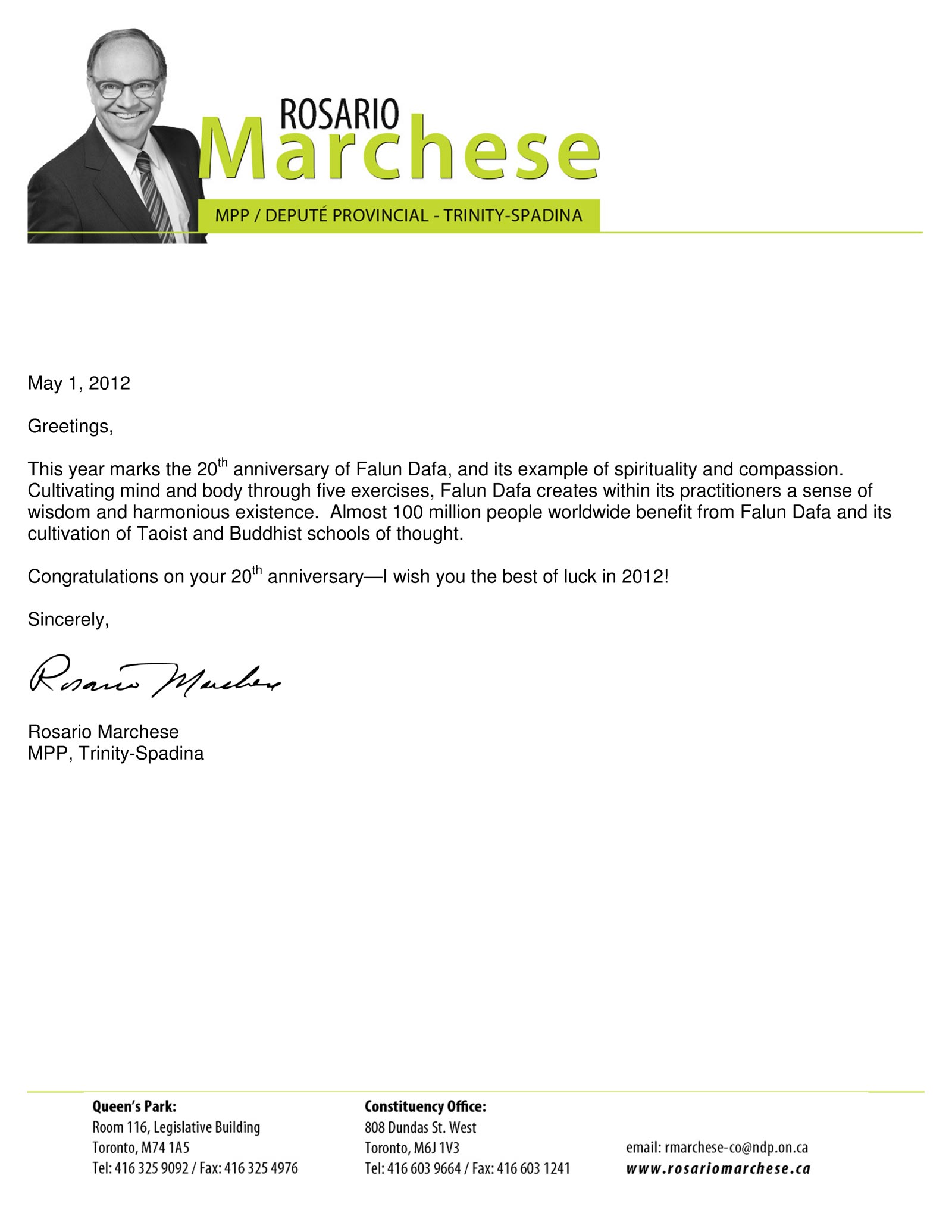 省议员Rosario Marchese在信中表示:“今年是法轮大法传出二十周年。法轮大法遵循对善良的信仰和精神层面的追求。通过五套功法修炼身心,法轮大法让修炼者获得内在的智慧及和谐。全球有近一亿人从法轮大法的修炼中受益。祝贺你们的二十周年庆典。愿你们在二零一二年一切顺利!”