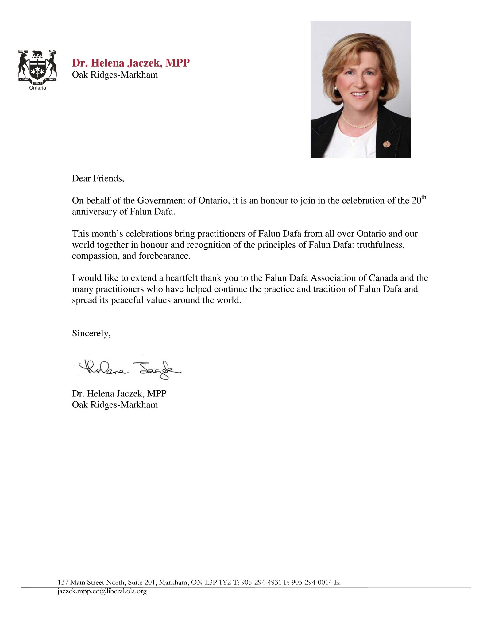 加安大略省议员Helena Jaczek在信中表示:“亲爱的朋友们,代表安大略省政府,我为能参与此次二十周年的庆祝活动感到荣幸。这个月的庆祝活动让安大略省和全世界的法轮功修炼者们欢聚一堂,庆祝法轮大法的'真善忍'理念。我衷心的感谢加拿大法轮大法协会和众多的法轮功学员坚持着你们的信仰并,将法轮大法和平的理念传遍世界。”庆大法洪传二十周年