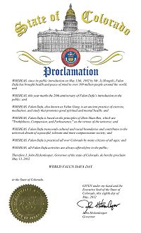 二零一二年五月八日,美国科罗拉多州州长约翰·希肯鲁柏签发褒奖,宣布二零一二年五月十三日为科罗拉多州的世界法轮大法日。