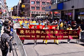 二零一二年五月十二日,来自世界各族裔、七千名左右的法轮功学员汇聚纽约曼哈顿唐人街,举行了一次规模盛大的游行,庆祝法轮大法洪传世界二十周年,第十三届世界法轮大法日。