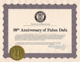 褒奖证书能够代表密西根人民,和大湖区和世界80多个国家的法轮功修炼者共同庆祝这一最著名的修炼方法洪传20周年,是我极大的荣幸。