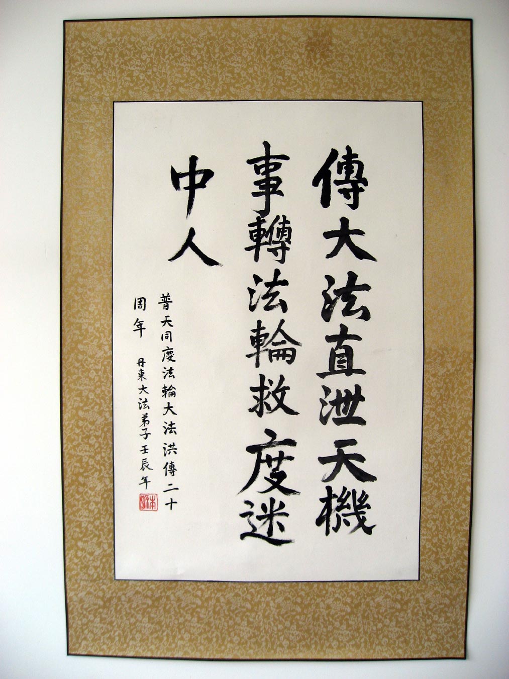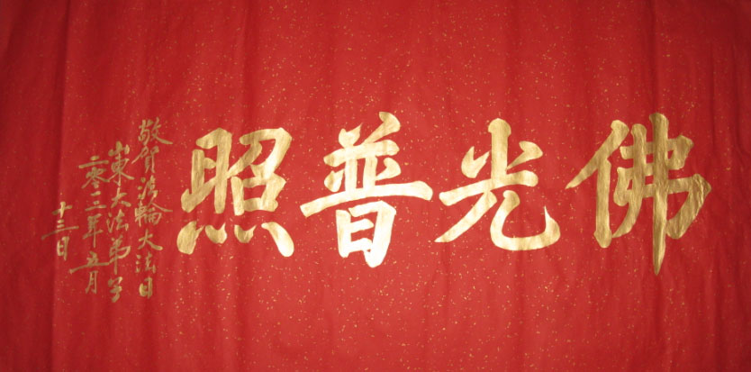 由于前来参加法会的人数众多,法会分为主会场和多个分会场。在主会场的主席台上鲜花芬芳,正中是师尊大法像,两边是写有“法轮常转”和“真善忍”的法轮图形。“正念可救世中人”、“慈悲能溶天地春”的竖幅悬于两边。面对主席台,左侧是横幅“学法不怠变在其中,坚信不动果正莲成”和“精進正悟”;右侧是“大法圆容乾坤正,法王慈悲造大穹”和“法轮常转”,后面是“真善忍”。