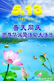 【明慧网二零一二年五月十四日】二十年前的五月十三日是历史见证神奇的开始。五千年的中华神传文化铺垫后,冥冥之中人们等待的、期盼和寻觅的人成神的通天之路开始在世人面前展开——一九九二年李洪志先生第一次公开将法轮修炼大法传给了世人。大法洪传世间二十载始终伴随着神迹,只有经历了净化、重生和被救度的生命才能真正感悟到法轮大法的殊胜和神圣。