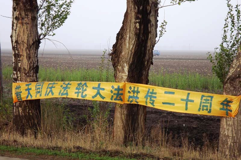 河南大法弟子悬挂真相横幅庆祝法轮大法洪传二十周年