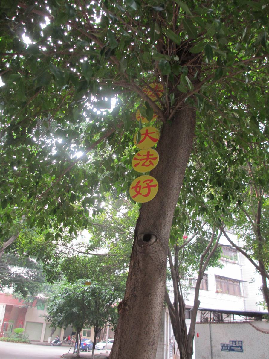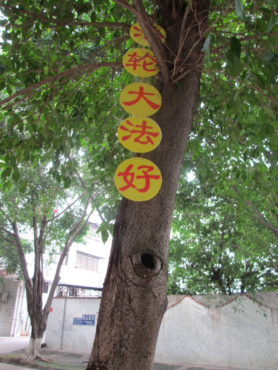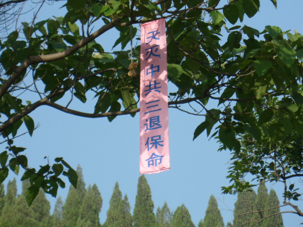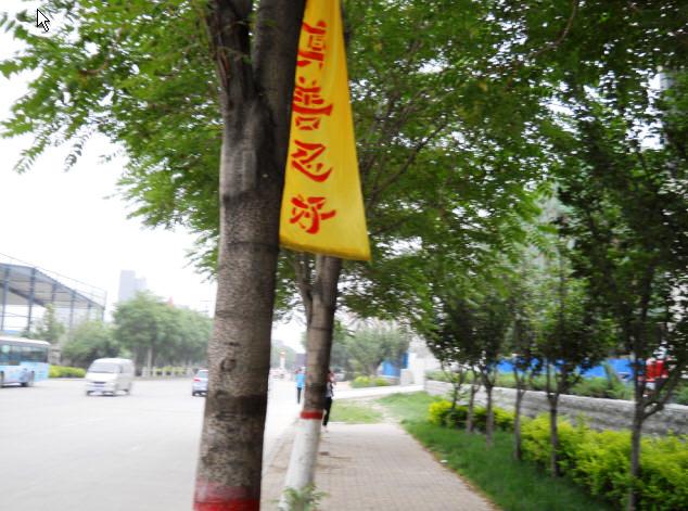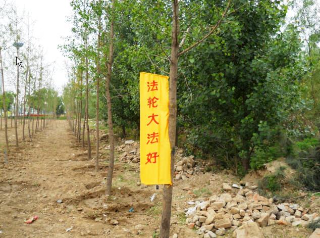 今年5月13清晨,东北某市的街道两侧树上、公园里、农村的公路两侧树上、桥栏杆上、村屯里,到处都飘扬着“法轮大法好”,“天灭中共、三退保命”,“恭祝五•一三世界法轮大法日”的真相条幅,还有“普天同庆五•一三世界法轮大法日”的横幅。建筑物上、墙上贴有“庆祝5•13法轮大法日”、“法办周永康”等真相图片,在乡村、在集市上缓缓飘过带有“法轮大法好”和“恭祝五•一三世界法轮大法日”真相条幅的氢气球。大法弟子感谢师尊救度之恩,以各种方式向世人讲清真相,救度众生。