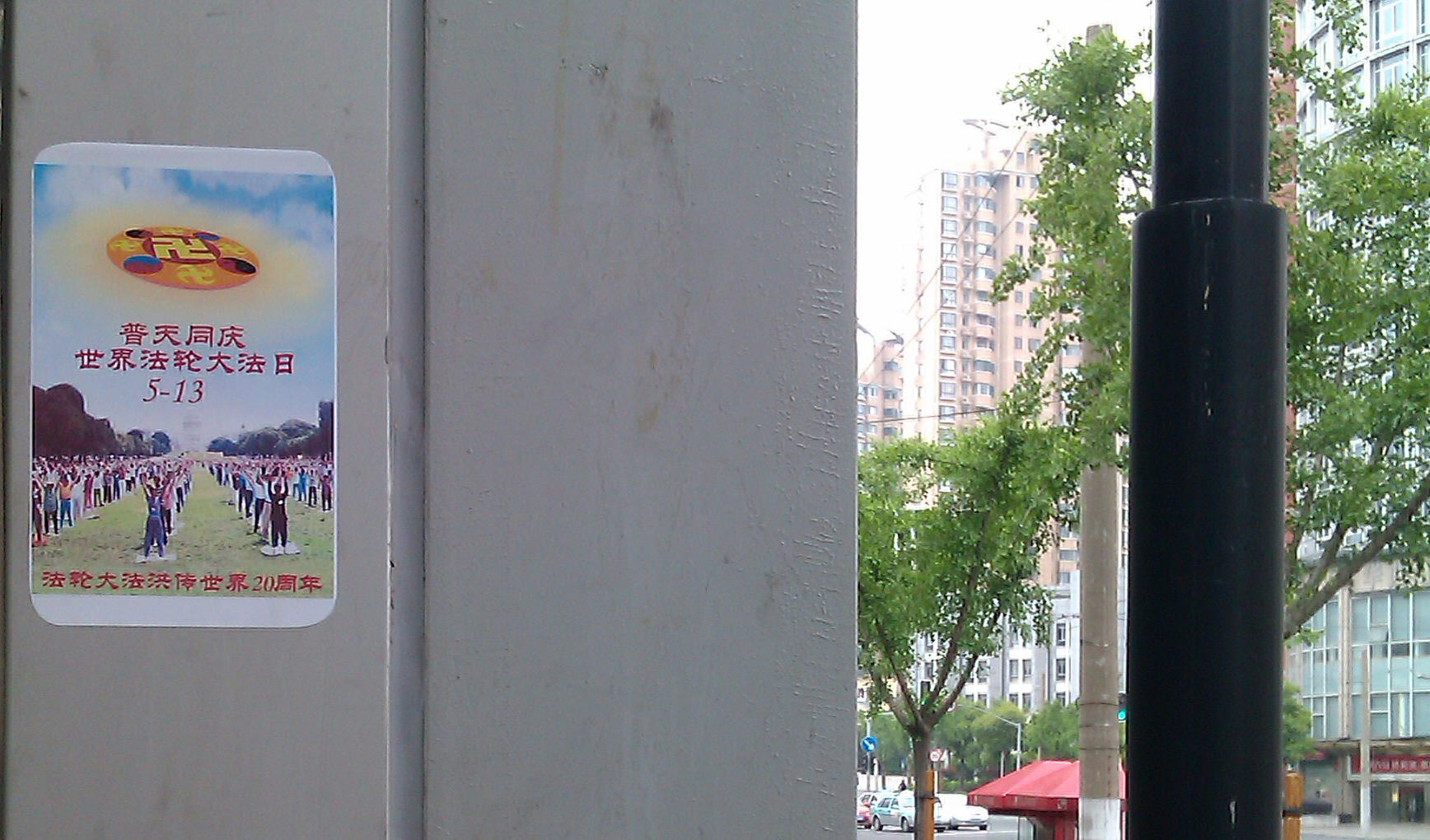 这是中国大陆华东某大城市,于2012年5月13日为庆祝世界法轮大法日、法轮大法洪传二十周年,拍摄的当日当地的真相图片。因为大陆的特殊情况,只是截取了局部的小图。