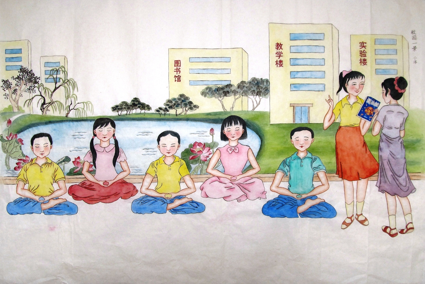 稿件简介:画面表现的是九九年七•二零前,大陆某大学校园法轮功洪传的情景,表现法轮功在教育界高教系统传播的盛况。画面上,绿树掩映的大学图书馆、教学楼、实验楼(远景)前,(中景)左边是一池宁静的湖水、荷花盛开,右边是绿草如茵的一大片草坪。宁静的湖水、盛开的荷花、和草坪前(近景)左边是三个男生、二个女生在打坐炼功,右面是一名站着的法轮功学员在向一位路过的女生介绍法轮功、洪扬大法。