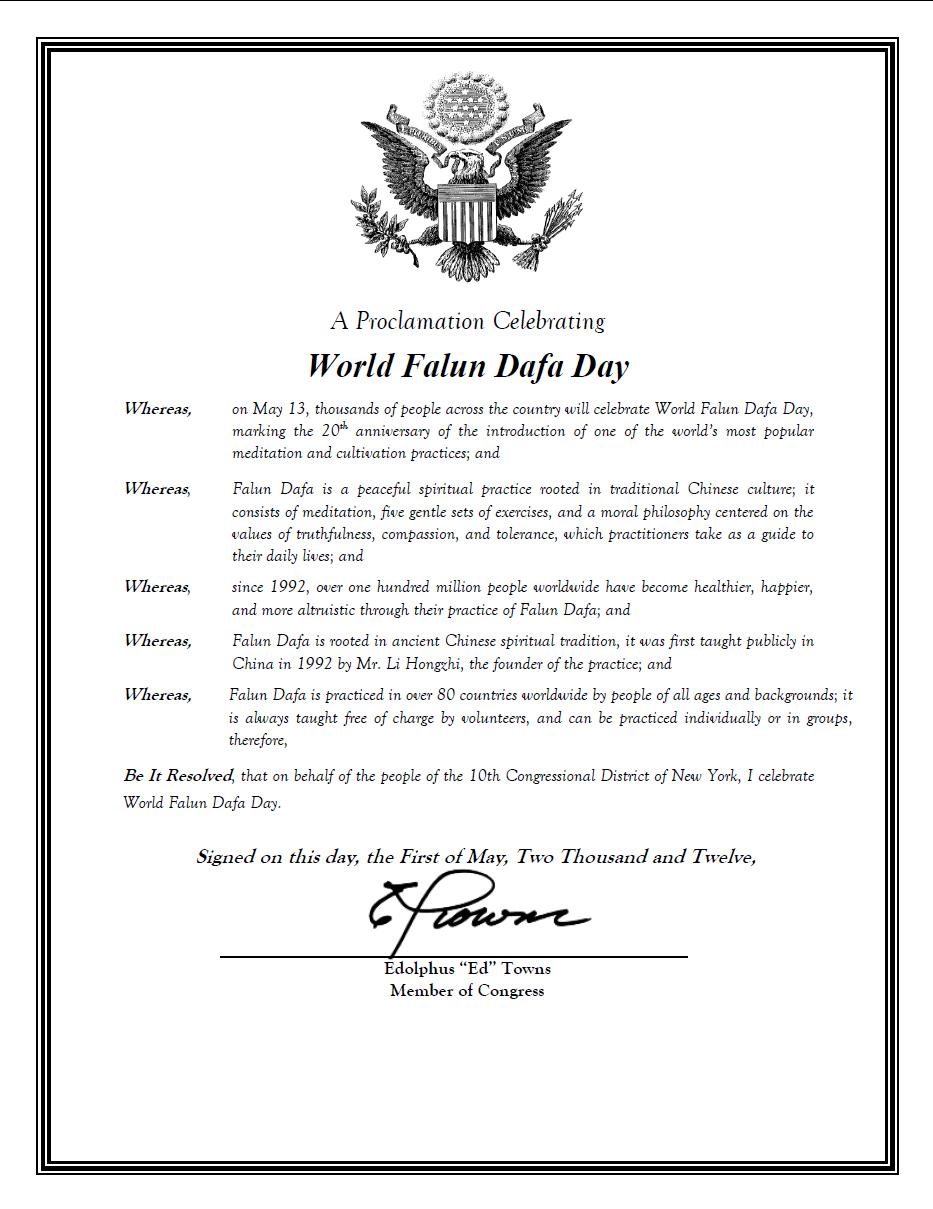 【明慧网二零一二年五月八日】为庆祝即将到来的法轮大法洪传世界二十周年,美国纽约州第十区的国会议员爱德·唐(Edolphus “Ed” Towns)颁发褒奖,庆祝世界法轮大法日。褒奖译文如下:
