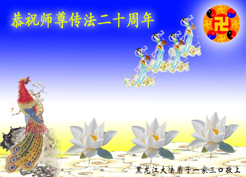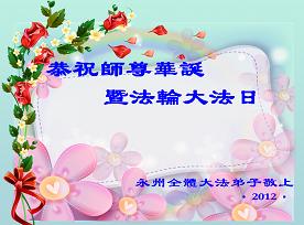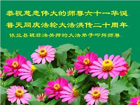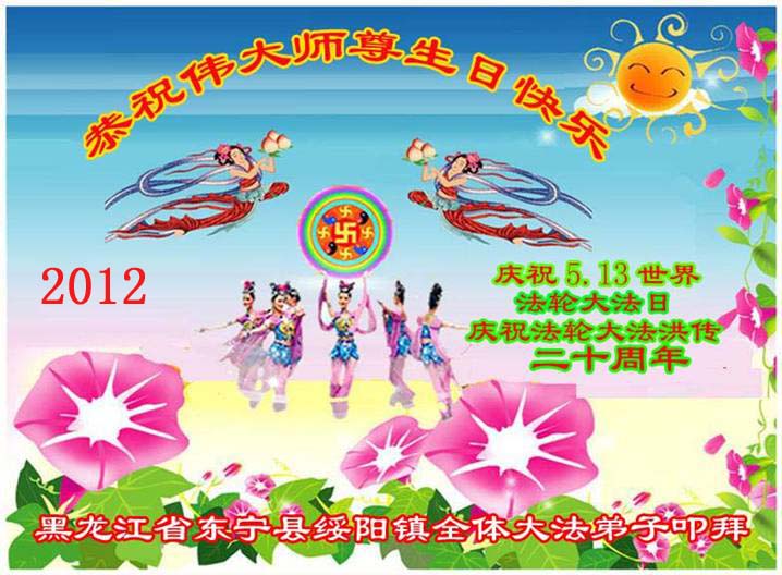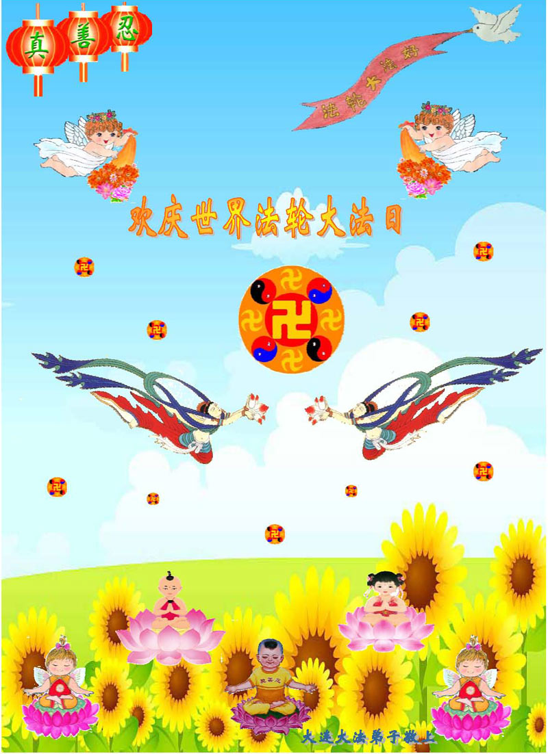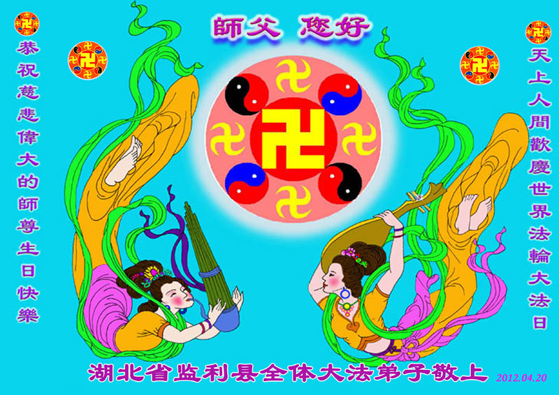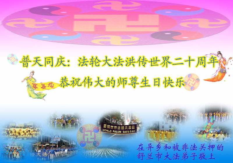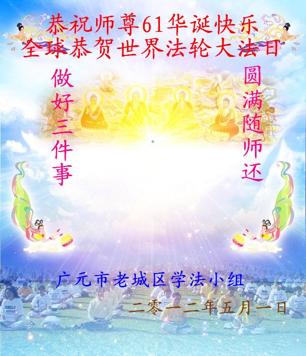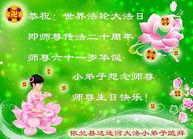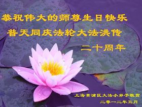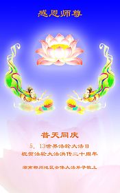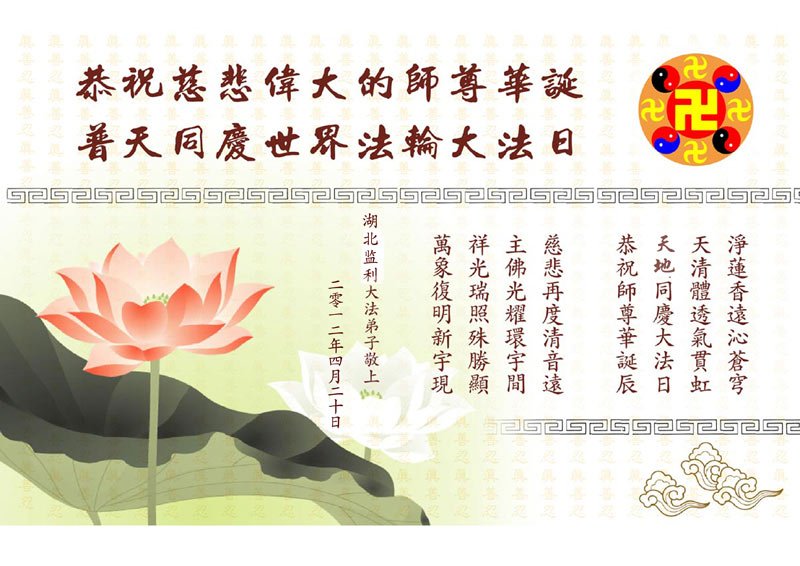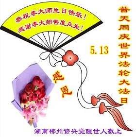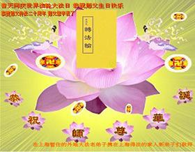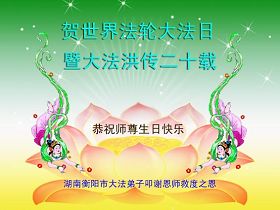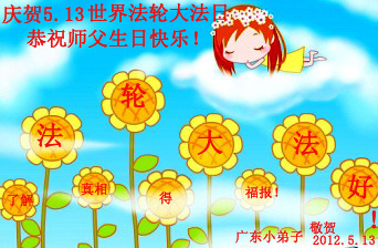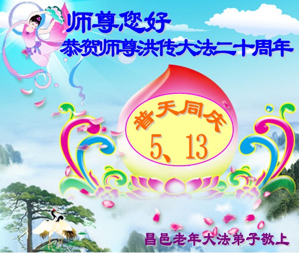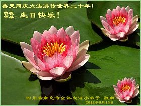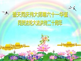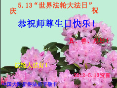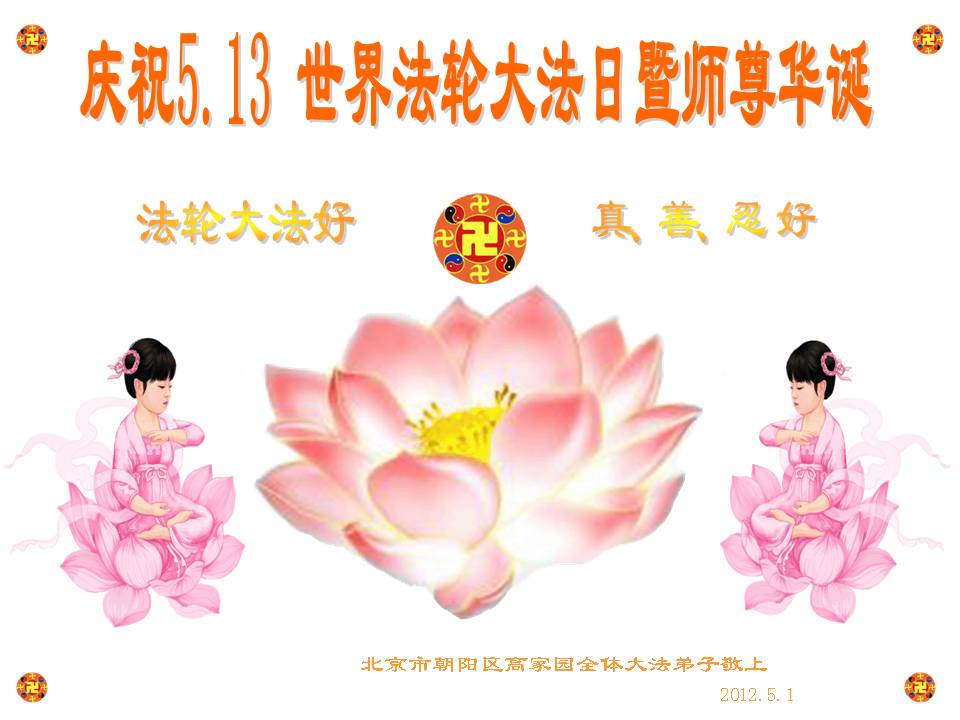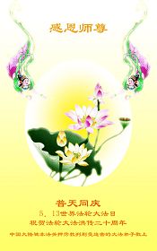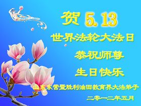 【明慧网二零一二年五月九日】二十年前的五月,李洪志师父在中国长春将法轮大法公开传出于世,二十年后的今天,法轮大法洪传全球,亿万修炼者在大法“真善忍”的指导下道德升华,获得身心健康。十三年来,每年的五月十三日,不仅世界各地的法轮大法弟子都向明慧网寄来贺卡贺词,恭贺师尊华诞并庆祝“世界法轮大法日”,越来越多明白真相的世人和大法弟子的亲属也纷纷通过明慧网表达他们对李洪志师父的感恩并恭贺李洪志师父华诞。