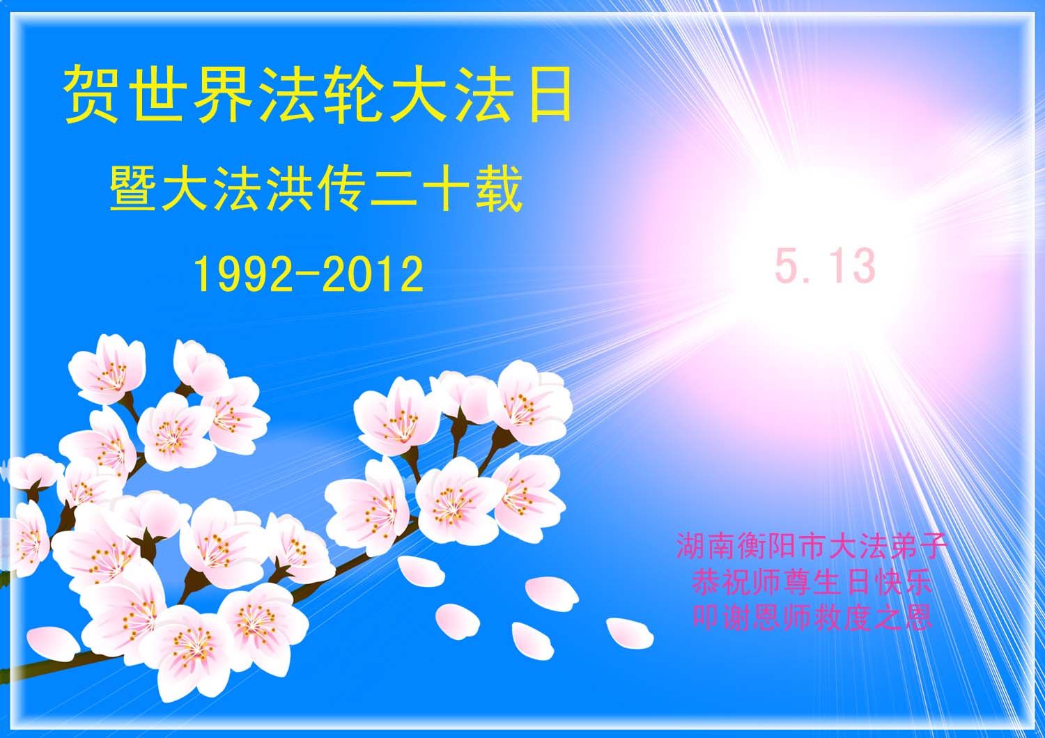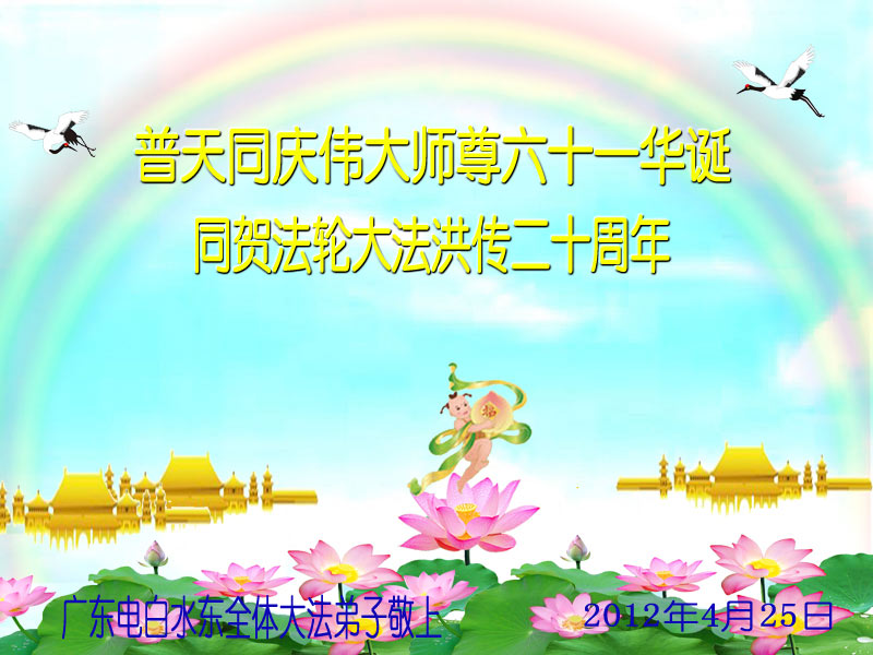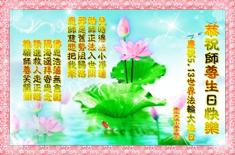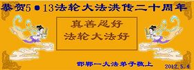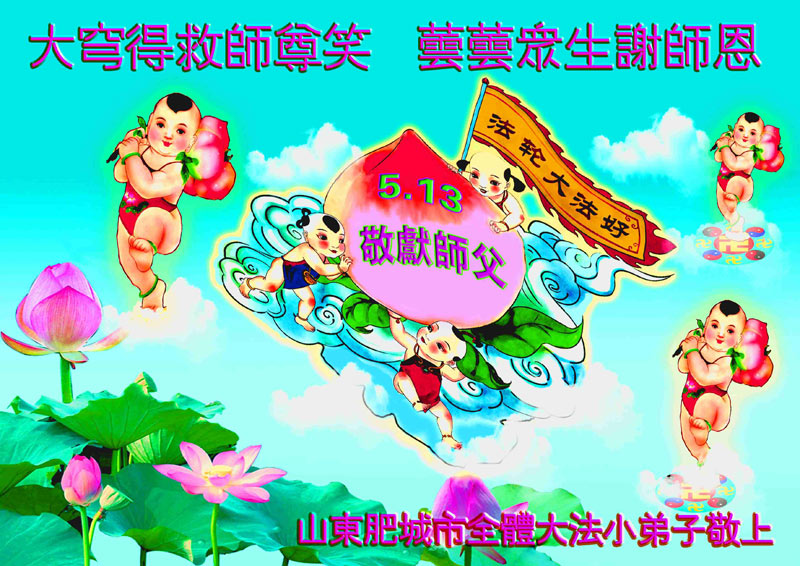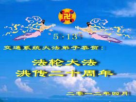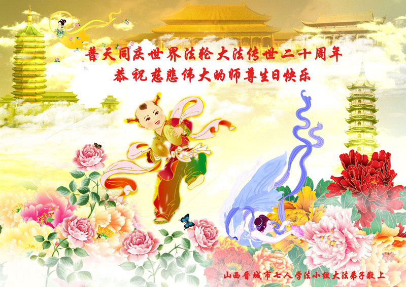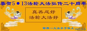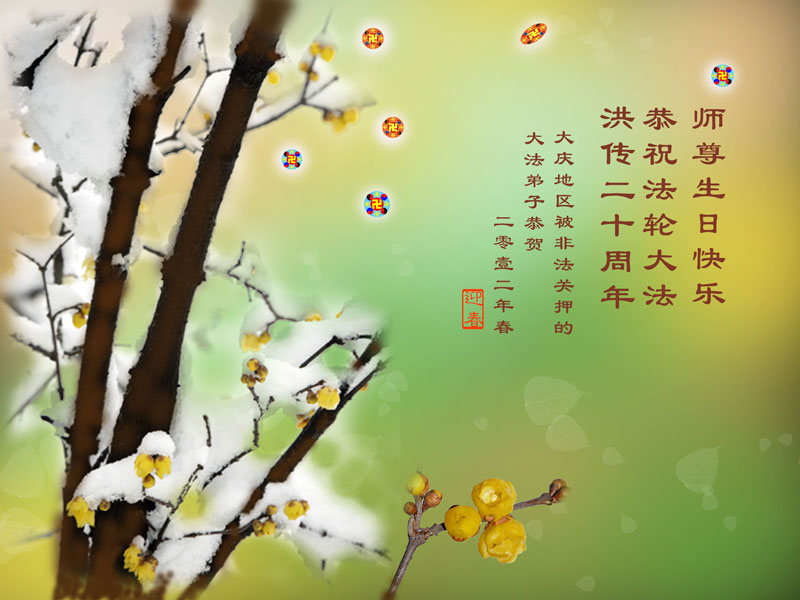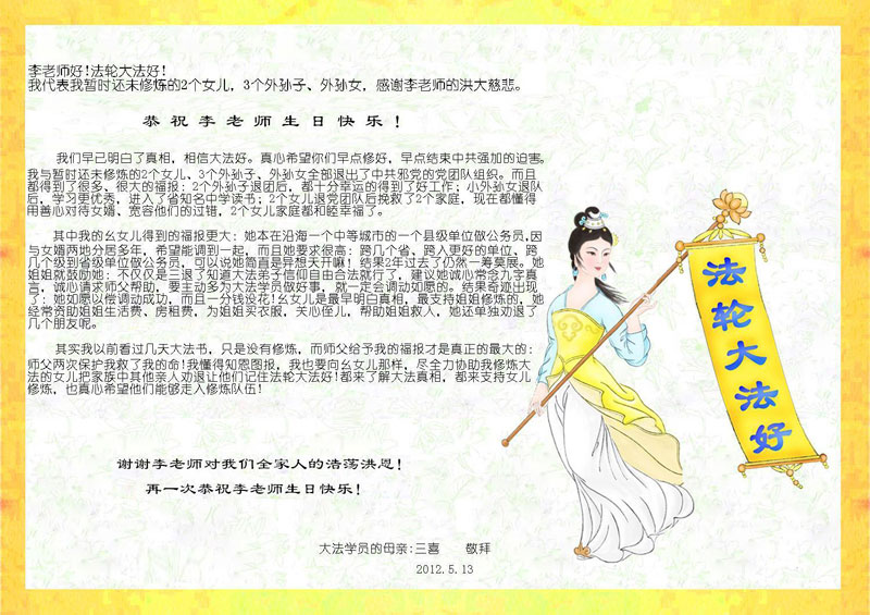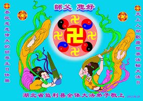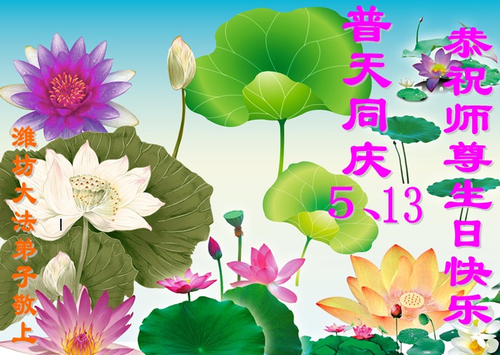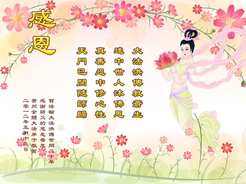 【明慧网二零一二年五月九日】二十年前的五月,李洪志师父在中国长春将法轮大法公开传出于世,二十年后的今天,法轮大法洪传全球,亿万修炼者在大法“真善忍”的指导下道德升华,获得身心健康。十三年来,每年的五月十三日,不仅世界各地的法轮大法弟子都向明慧网寄来贺卡贺词,恭贺师尊华诞并庆祝“世界法轮大法日”,越来越多明白真相的世人和大法弟子的亲属也纷纷通过明慧网表达他们对李洪志师父的感恩并恭贺李洪志师父华诞。