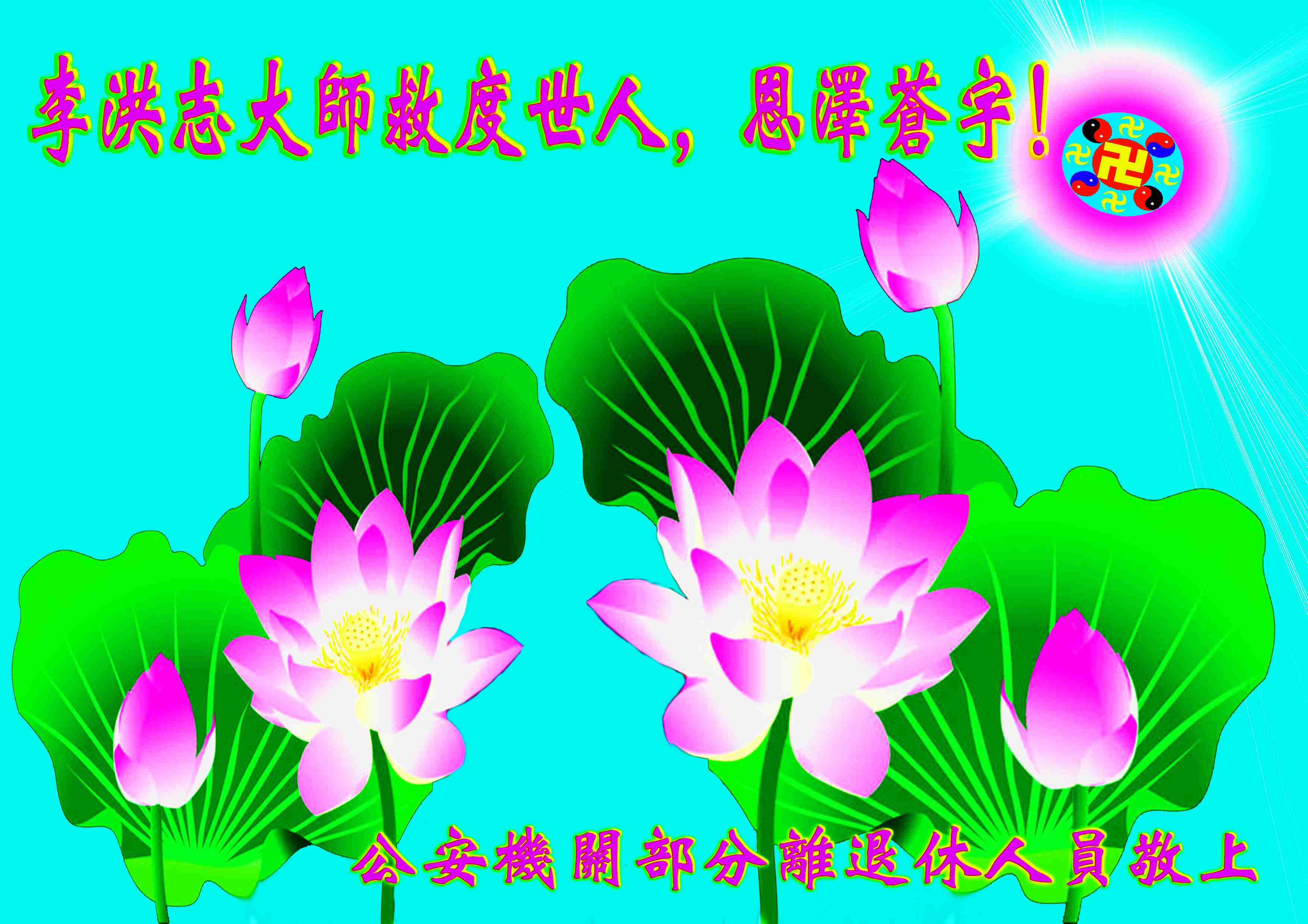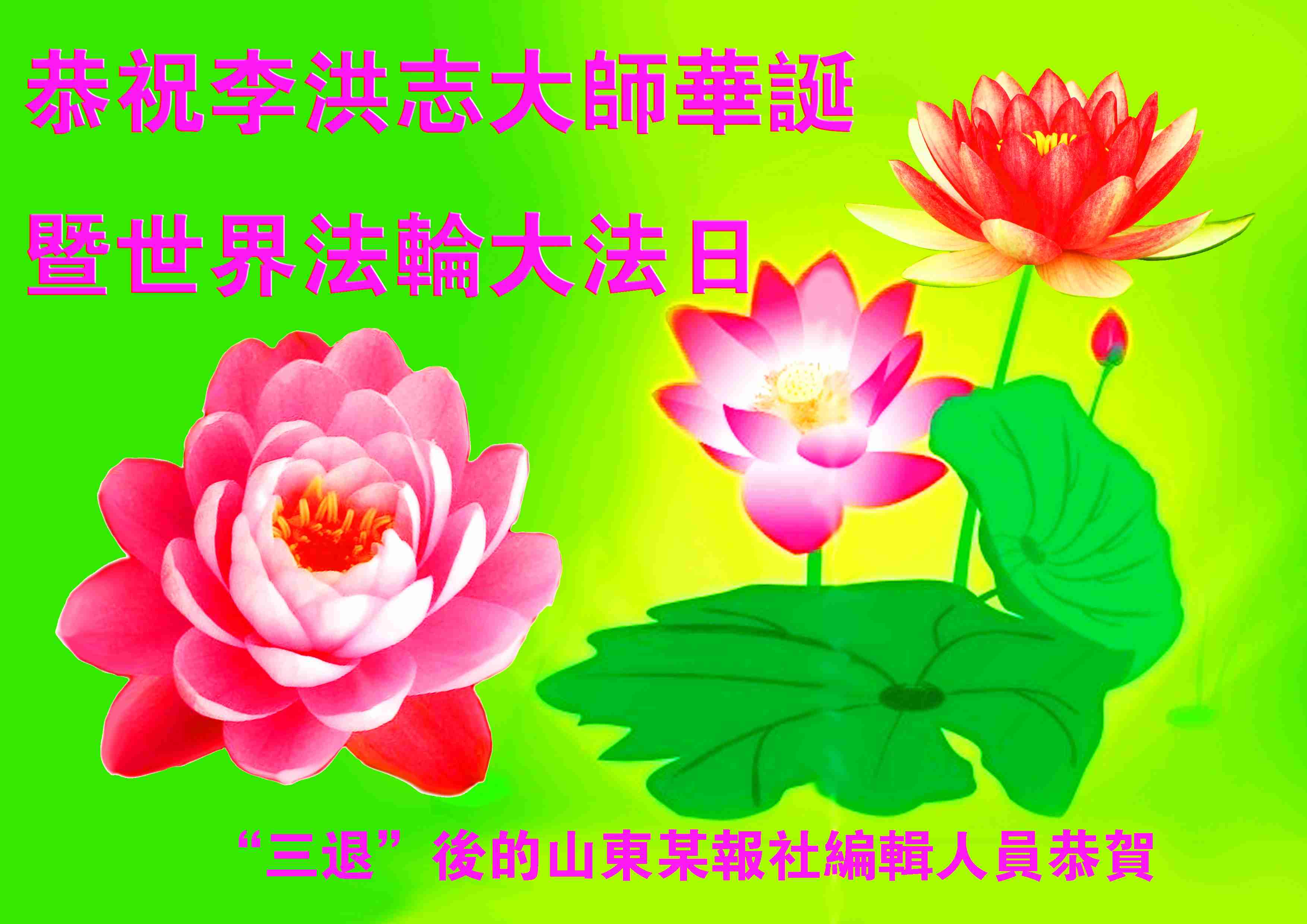 伟大的李大师您辛苦了!我们谨代表亲朋好友向伟大的李大师致以最崇高的祝福,祝福李大师生日愉快!伟大的李大师慈悲众生,慈悲世间万物,把宇宙最高的佛法真善忍大法慈悲洪传于世。因宇宙大法洪传,万物众生善良的本性在逐渐的复苏,一日千里的往上提升,真是佛光普照礼义圆明,使人们仿佛又回到了中国古老的传统文明中,人与人之间都在传递着善良的福音。在此我们也奉劝那些还没有退出中共邪党的世人,不要再听信中共邪党一言堂的蛊惑,共产邪灵千真万确在往地狱里拉人,不要做邪党的陪葬品。其实我们理性的衡量一下就知道善与恶的区别,纵观历史,自从共产邪党一出现,它就没有做过好事,希望你们静下心来去翻阅一下历史的档案,再看一看李大师带领的法轮功弟子是如何做的。真修向善的大德之士在当今反被打压迫害,人们真得清醒的做一下反思,不为别的只为给自己一个美好的未来,只为不能再做邪党的牺牲品,慈悲的李大师还在等待着众生,法轮功弟子还在苦口婆心的向你们诉说着真相。迷失的世人啊,赶快清醒吧!叩拜慈悲伟大的李大师!