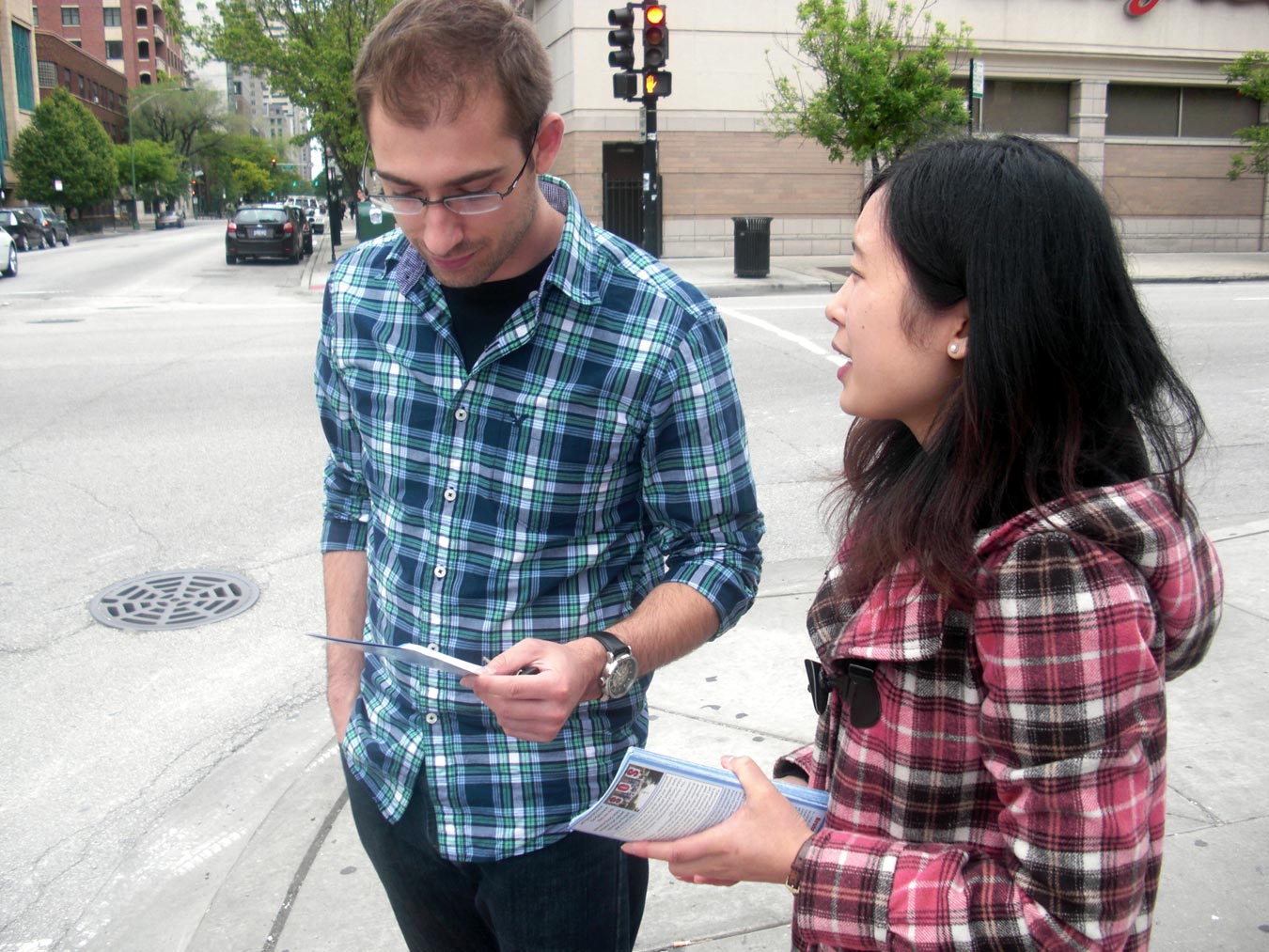 一位深圳来的女孩仔细地看着法轮功学员的横幅内容,不禁说道:“如果这些都是真的,应该停止(迫害),应该让真相大白。”