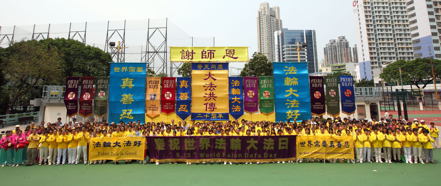![]() 二零一二年五月六日,数百名在香港的中外法轮功学员庆祝法轮大法洪传二十周年,同时恭贺师尊华诞。 |