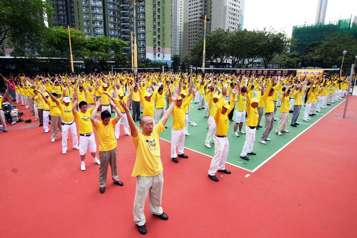 经过多日下雨,这个周日天气放晴,包括香港、台湾、澳门及来自东南亚等地的法轮功学员,身穿黄色炼功服,一早就聚集在九龙长沙湾游乐场,随着音乐整齐炼功,祥和的气氛感染经过的途人,纷纷放停脚步观看。