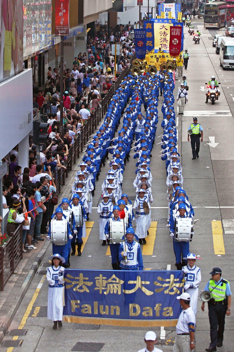 下午二点,庆祝大法洪传二十周年的游行开始,在天国乐团领头下,游行队伍浩浩荡荡的沿着九龙区的闹市缓缓前进,途经深水埗、旺角、油麻地、尖沙咀等繁华路段,各式弘扬大法、反对迫害及声援退党的幡旗横幅,以及雄壮响亮的鼓乐声,吸引沿途的香港市民及中外游客驻足观看,纷纷拿出相机、手机拍照留念。