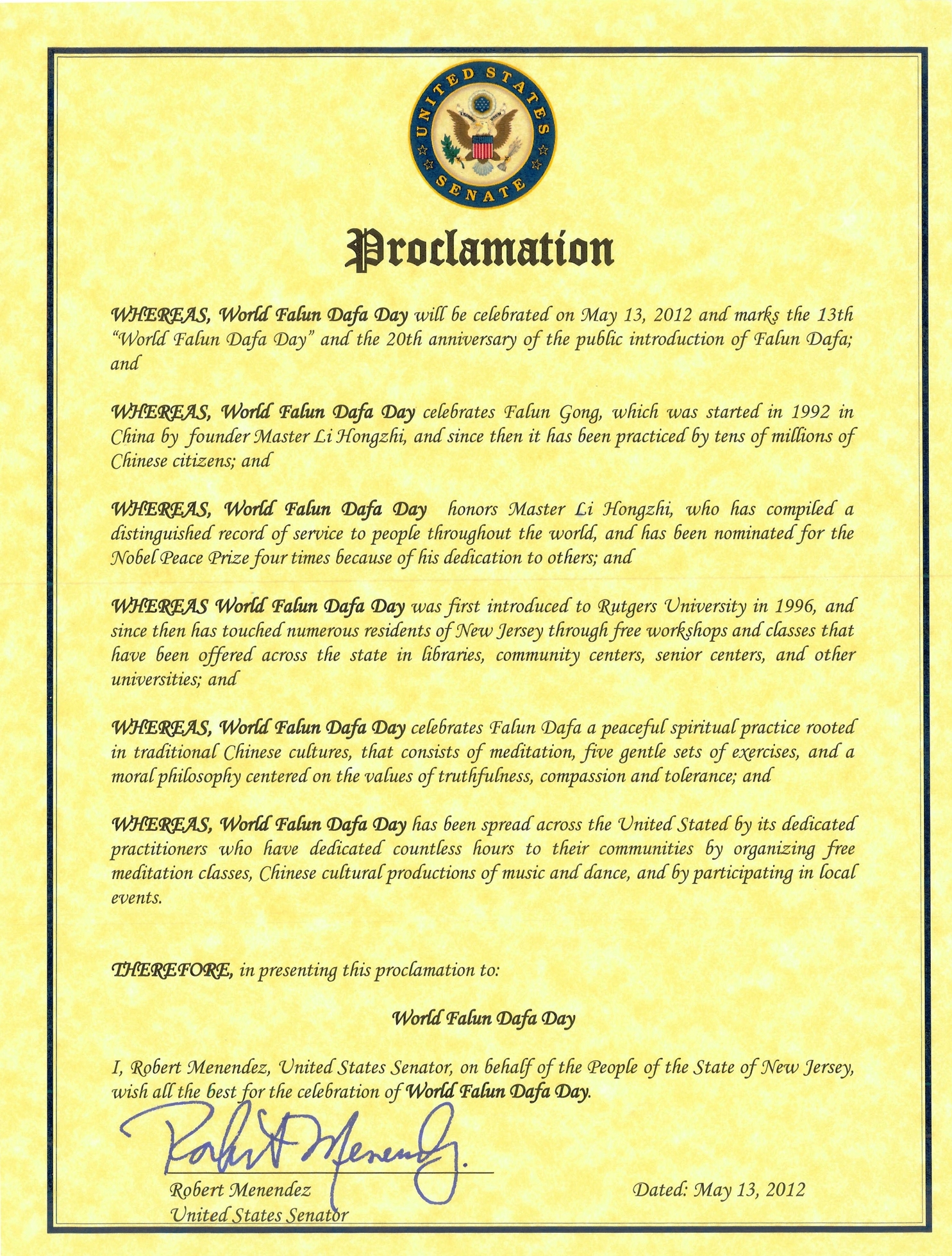 鉴于,这项法案认同新泽西法轮大法月中的五月十三日“世界法轮大法日”的重要性,以及表彰法轮大法创始人李洪志大师的重大贡献。鉴此,