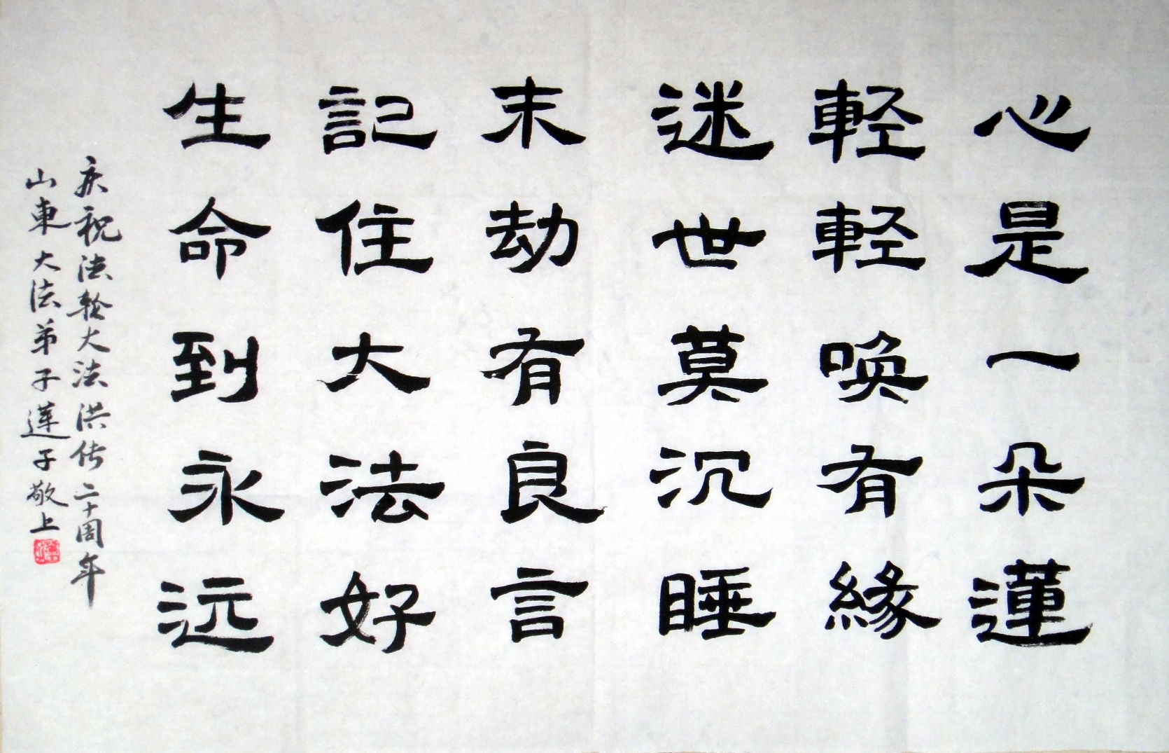 《十三年前,我在拘留所遇到法轮功》记述的是一位山东民营企业家,一九九七年有人告诉她说:“你不是一般人,你是从天上下来的,送你一副对联吧!”对联写的是“佛光普照礼义圆明”。后来因为债务纠纷她被抓后关到拘留所,在里面遇到一位法轮功学员,一看大法的书便落泪哭了。她明白了高人话的含义,回家后成为真正的修炼者。