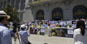 二零一二年六月十四日中午,百余名美国旧金山湾区的法轮功学员在旧金山市政厅前召开新闻发布会,向公众揭露中共将迫害法轮功延伸至旧金山,煽动仇恨,操控暴徒在唐人街谩骂并殴打法轮功学员;同时,要求市政府追查及法办凶徒,保障法轮功学员的安全及合法权益,制止中共将仇恨输出到美国。
