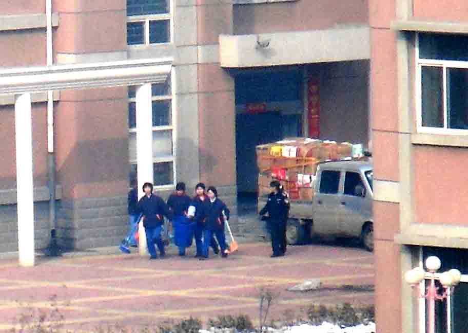 ![]() 河北女子劳教所内部(右下角有装货车) | ![]() 局部放大:被劳教所人员、警察、货车 |