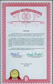 【明慧网二零一二年七月十二日二零一二年七月十一日,美国密西根州第十五区参议员麦克.考沃先生和第三十八区州众议员休.克劳福特联合签署了一份特别感谢状,以此表彰法轮大法及其修炼者带给世界的贡献。