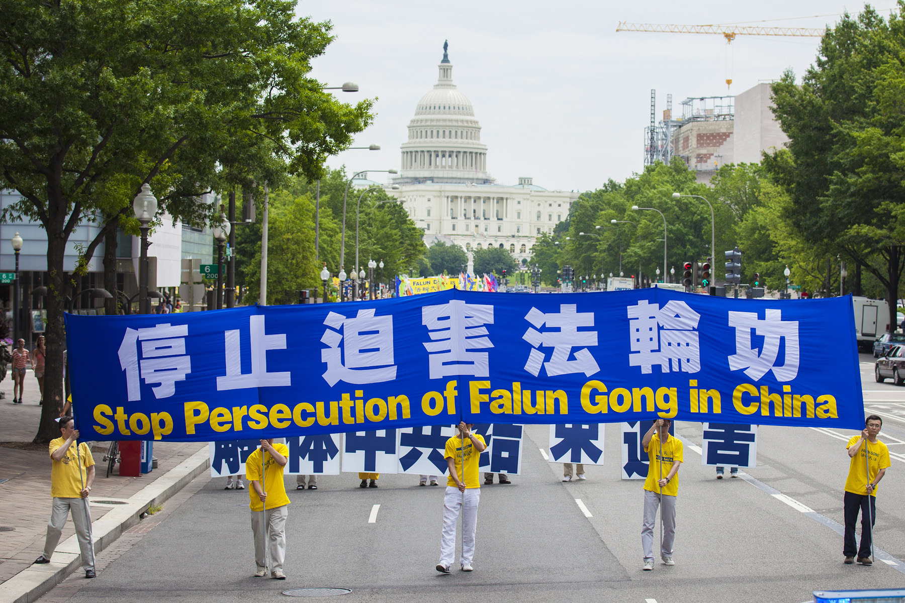 游行队伍分为“大法洪传世界”、“千古奇冤——法轮功受迫害”以及“声援一亿两千万中国民众声明退出邪党及其相关组织”等方阵。“法轮大法好”、“世界需要真善忍”、“制止迫害法轮功”等各种法轮功真相横幅和展板等在美国华盛顿DC宽阔的宾西法尼亚大道筑成了壮观的真相长河。