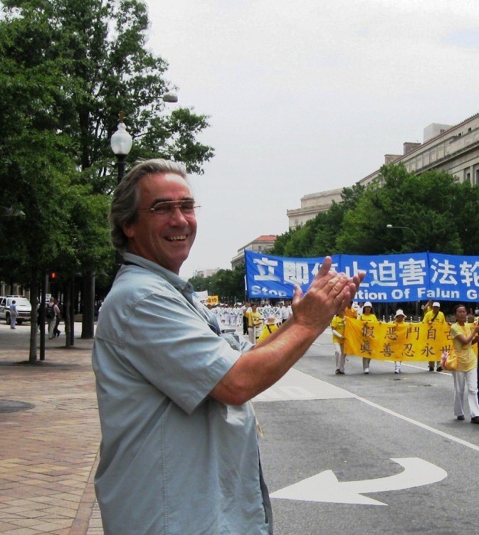 ![]() 观众Robert一直对着游行队伍鼓掌表示支持,当看到白衣方阵的学员拿着被迫害致死的学员遗像走过来时,Robert哭了。 |