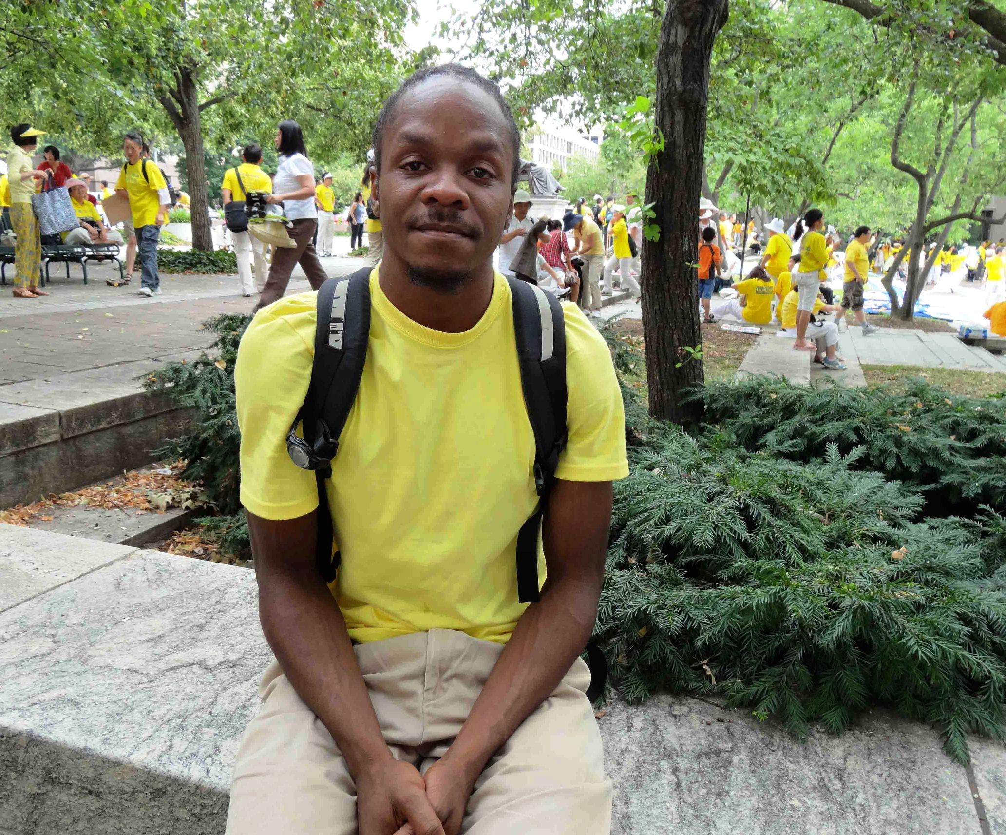 科林(Colin)是个年轻的黑人小伙子,来自弗吉尼亚州Fairfax市。他开始修炼才仅仅一个月。两年前在华盛顿接到一份真相资料,那是他第一次接触法轮大法,四个月前是通过朋友介绍后,他对法轮大法产生兴趣,开始了解法轮大法的修炼。他说:“我终于明白了,这正是我一生所要追寻的”,就这样,他成为了一名法轮大法新学员。他说:“我相信我的选择,我理解了法轮大法的原理,来到华盛顿DC是为了能和其他的法轮大法学员一起,支持法轮大法反迫害的活动, 支持其他的法轮大法学员。”