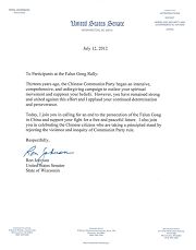 今天,我与你们一道呼吁结束在中国(中共)对法轮功的迫害,支持你们为自由与和平的未来而奋战。我也和你们一起庆祝亿万中国公民有理有节地拒绝中共统治下的暴力和不平等。