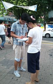 为了营救母亲,杨丽萍女士每个周末到富川市的地铁站前向民众征集签名。善良的韩国人了解情况后,踊跃签名,并祝愿朱春菊很快会被营救出来,迫害一定会停止,法轮功学员要加油。