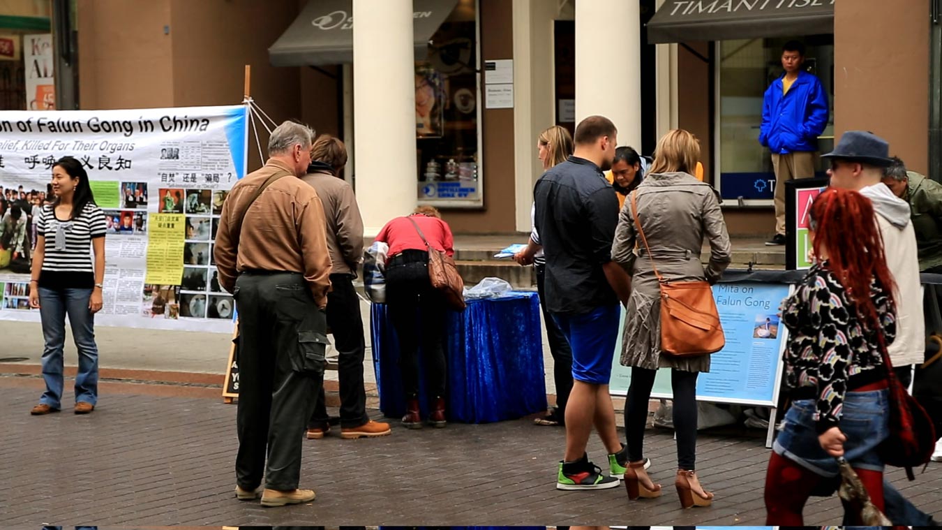 有许多中国人路过信息台。一个约十人的旅游团,匆匆路过信息台时,学员追过去跟领队的人说,赶紧了解真相,赶紧退出中共,这可以现在的第一等大事。后来领队的人接受了真相报纸,后面的人也就都开始拿真相报纸。有三个留学生小姑娘,一开始对特异功能、对活摘器官是否有证据等问题有着诸多的疑问,学员真诚解答后,她们非常受震撼。一位小姑娘了解了中共的本质,了解到中共不代表中国,了解到中共几十年间残害了八千万无辜的中国人后,马上决定退出中共相关组织。