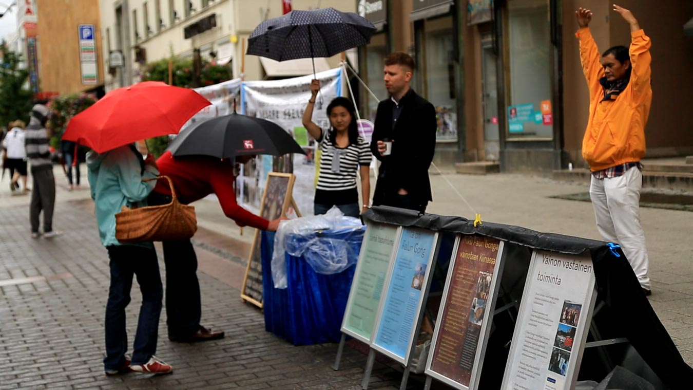 这篇名为《不妥协的人》的报道中说,在图尔库市中心的步行街,一群身着黄色T恤衫的法轮功学员正在忙碌着挂横幅摆展板,今天的雨并没有阻挡他们讲真相的活动。