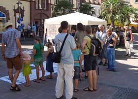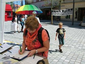 在德国拜罗伊特市(Bayreuth),市中心征集签名呼吁停止对法轮功学员器官活摘的活动继续进行。届时正是瓦格纳歌剧节期间,很多记者、旅游者、观众都在街上散步。扬声器里不断地播放着中共庞大的活摘器官、群体灭绝的黑幕、辽宁大连两个尸体工厂贩卖法轮功学员尸体的黑幕、每年中国大陆超过一万多个器官移植手术的货源黑幕,很多在烈日下走到台前来签字的德国人都说是听了扬声器的播音来的。