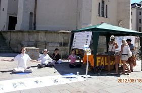 【明慧网二零一二年八月二十三日】媒体早就预告过,上周末德国将迎来本年度最热天气。果不其然,上周六(二零一二年八月十八日)烈日炎炎,不过德国雷根斯堡热闹的市中心却有一处清凉所在,伴随着悠扬动听的炼功音乐,法轮功学员在这里展示功法。被这祥和的氛围所感染,很多过往的行人驻足观看学员炼功,烈日下人们会问,象这样炼功要炼多长时间?他们不热吗?他们怎么那么静,好象周围的喧闹、炙热都跟他们没有关系?学员笑着解释,这不是简单的几个动作,这是修炼,炼功时会感到非常美妙、非常祥和,中国有句话叫做“心静自然凉”,也许正是因为这份心底的“静”,才让他们感觉不到周围的嘈杂、炎热。很多民众竖起了大拇指,并表示很希望能跟着学一下。