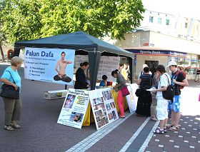 二零一二年八月四日,德国部份法轮大法弟子在美因茨的步行街举办了“信息日”活动,告诉世人什么是法轮功,法轮功在世界弘传,以及揭露中共对法轮功的血腥迫害的真相,同时征集支持反迫害签名。