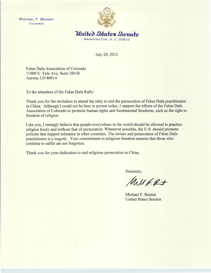 感谢邀请我参加要求中共停止迫害法轮功学员的集会。虽然我本人不能前往,但是我支持科罗拉多州法轮大法学会倡导人权和信仰自由等基本自由的努力。