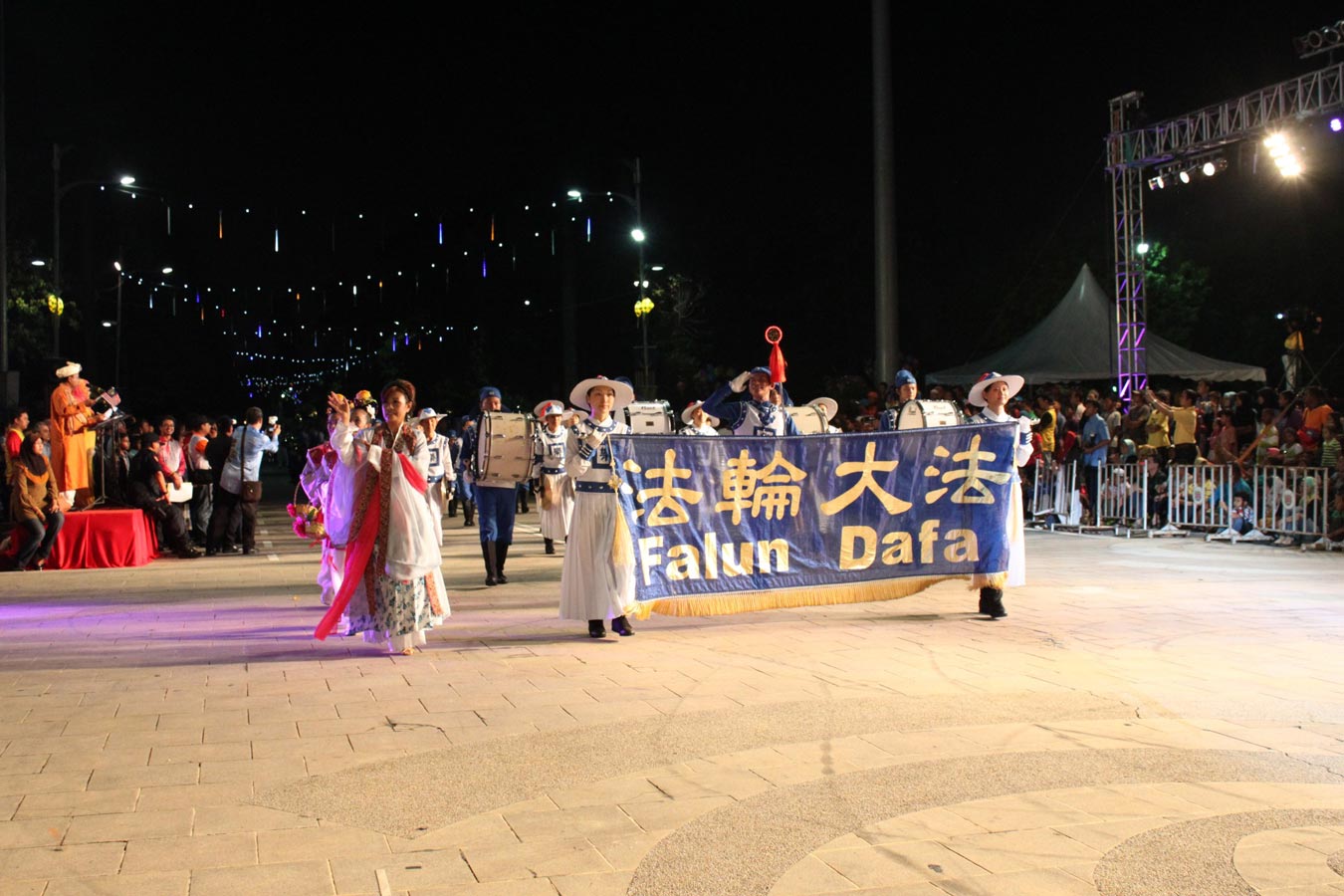当主持人宣布道:“正在走进来的是一个十分特别的乐队,这就是天国乐团,他们的座右铭(motto)是‘真、善、忍’,队伍人员有八十人,由琳达•苏女士带领,队员来自不同年龄层,从五岁至六十五岁。”