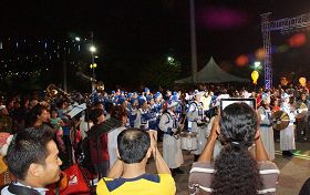 ![]() 天国乐团被安排压轴演奏马来著名民谣《Rasa Sayang》,获得民众欢迎,大家纷纷前来围观和竞相拍照与摄影留念。 |