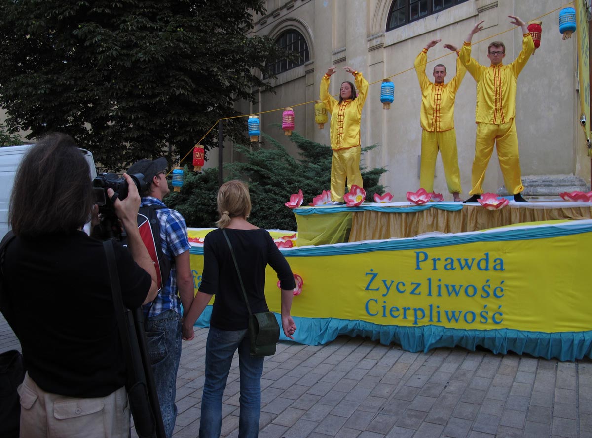 ![]() 华沙市民观看法轮功学员演示功法 |
