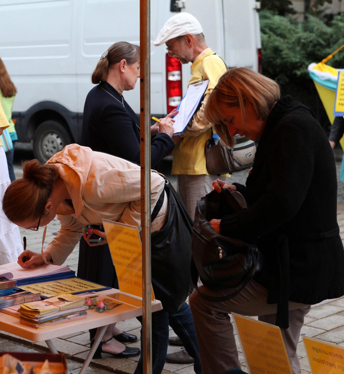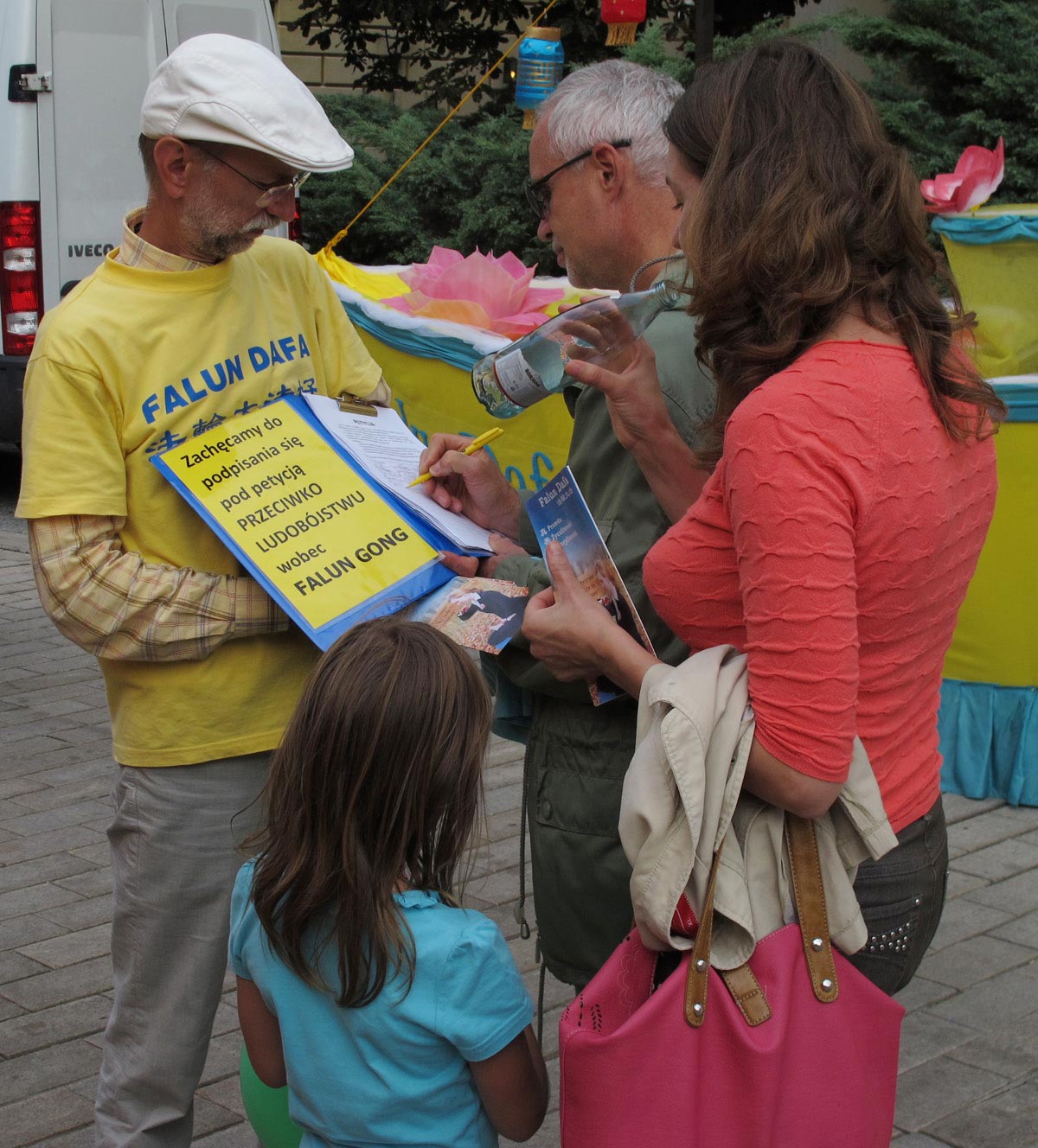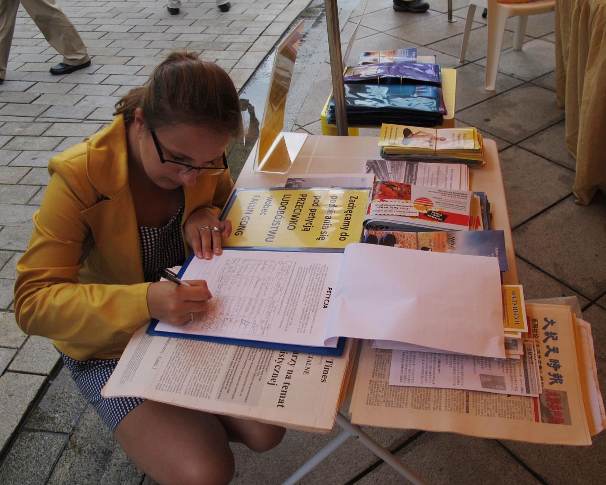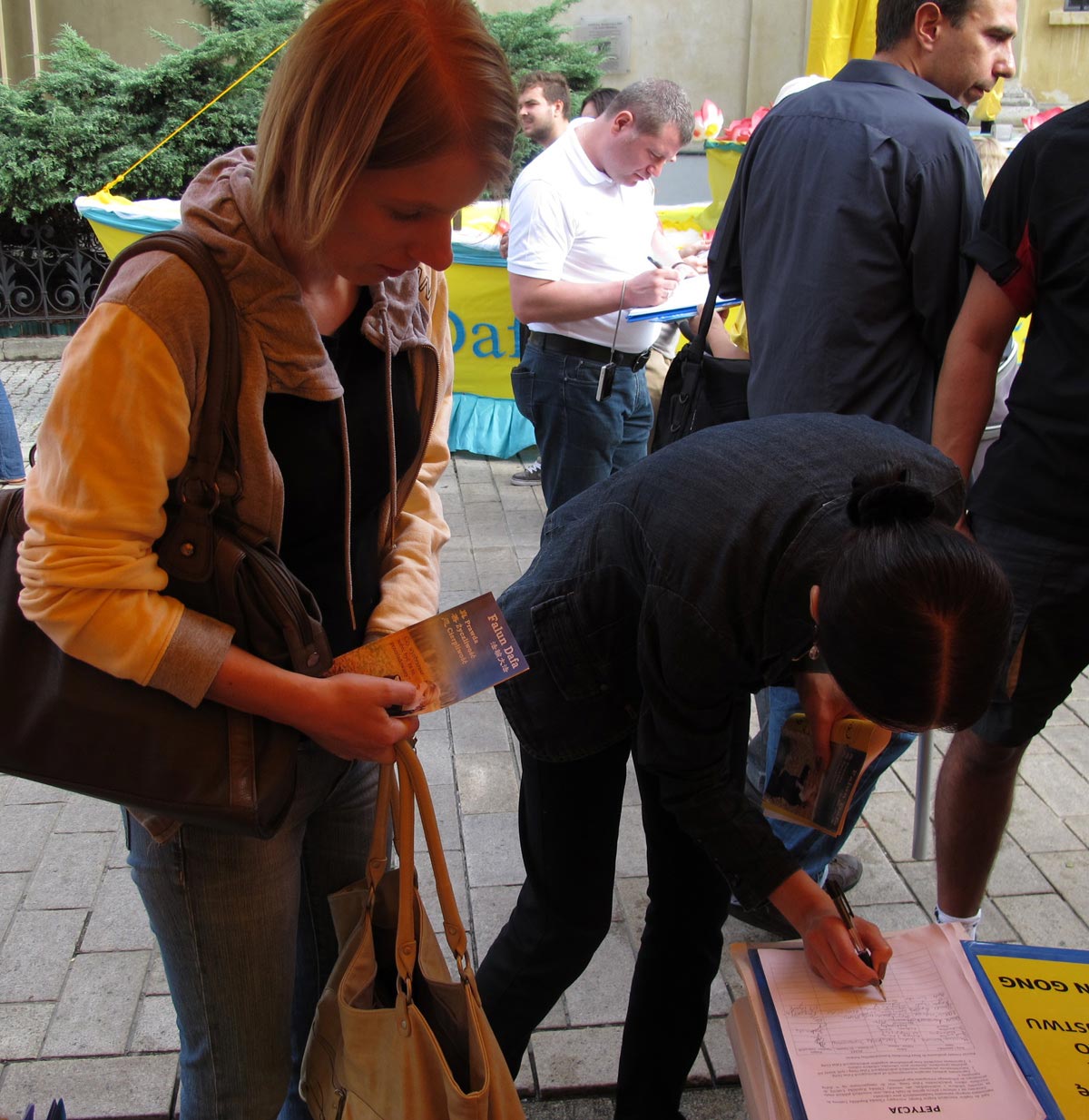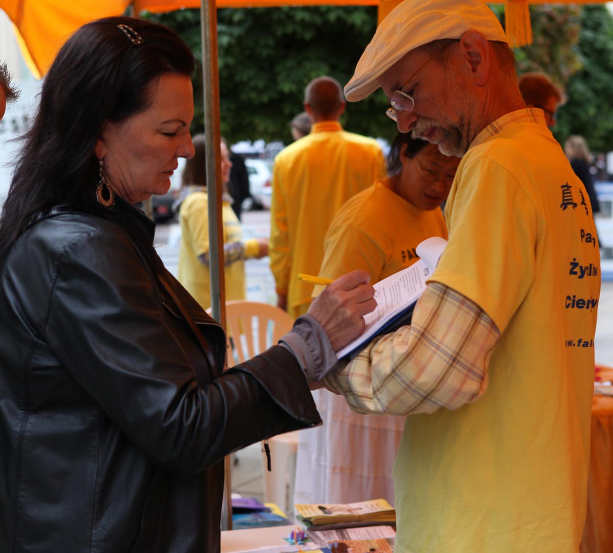 法轮功学员的真相讲解令在场的波兰人感到十分震惊,大家纷纷在反迫害的征签簿上签名,反对中共对法轮功的罪恶迫害。在五个小时中,有四百多波兰人在征签簿上签名。也有很多波兰人购买波语《转法轮》并找到法轮功学员做更深一步的了解。